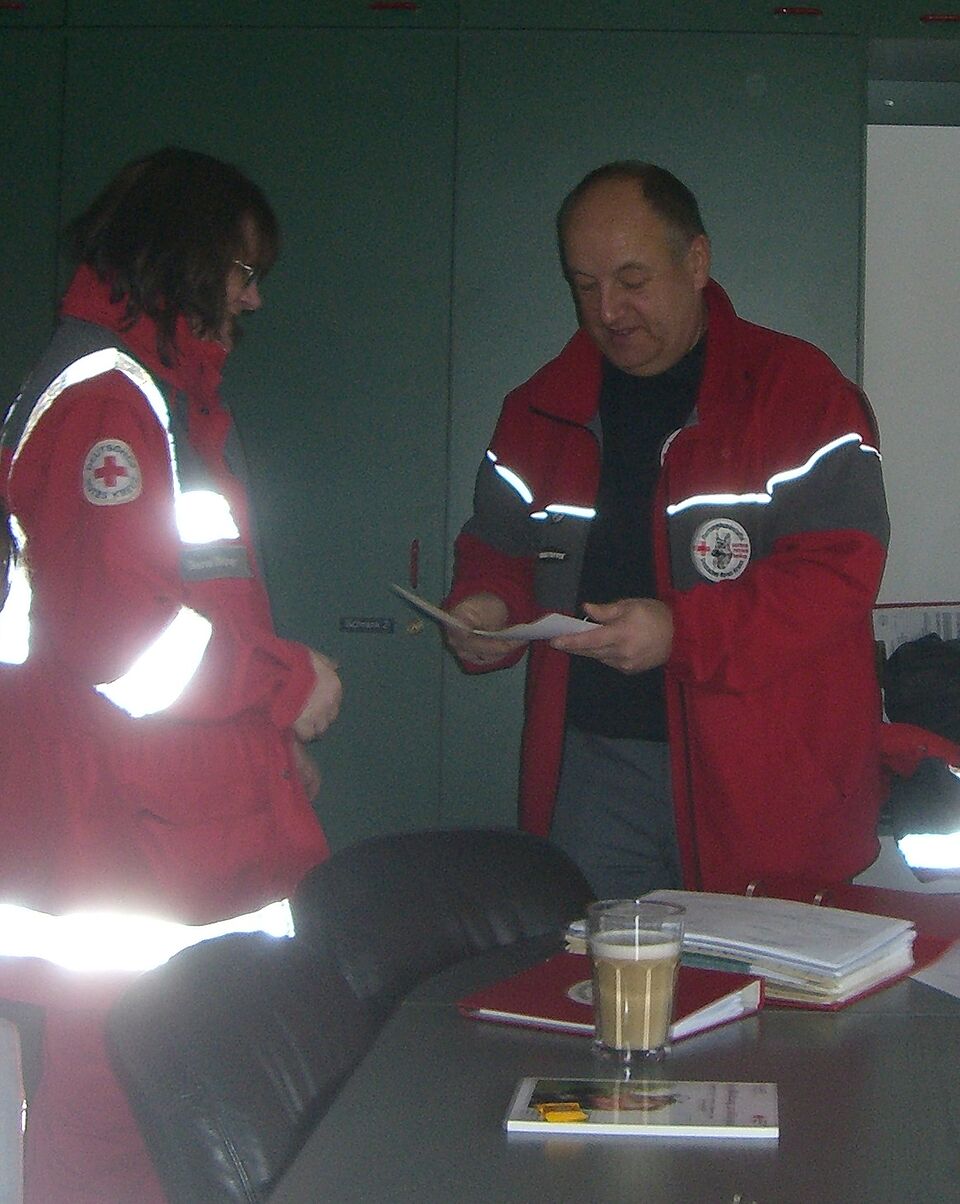 Dabei schafften das Rettungshundeteam Diana und "Jill" in den Prüfungsbereichen Fachfragentest, Verweis, Gehorsamsübung und Flächensuche durchweg gute Ergebnisse, so dass am Ende sehr zufrieden Prüfungsleiter Michael Meertz und Staffelleiter Franz Küpper die Urkunde überreichen bzw. entgegennehmen konnten.
