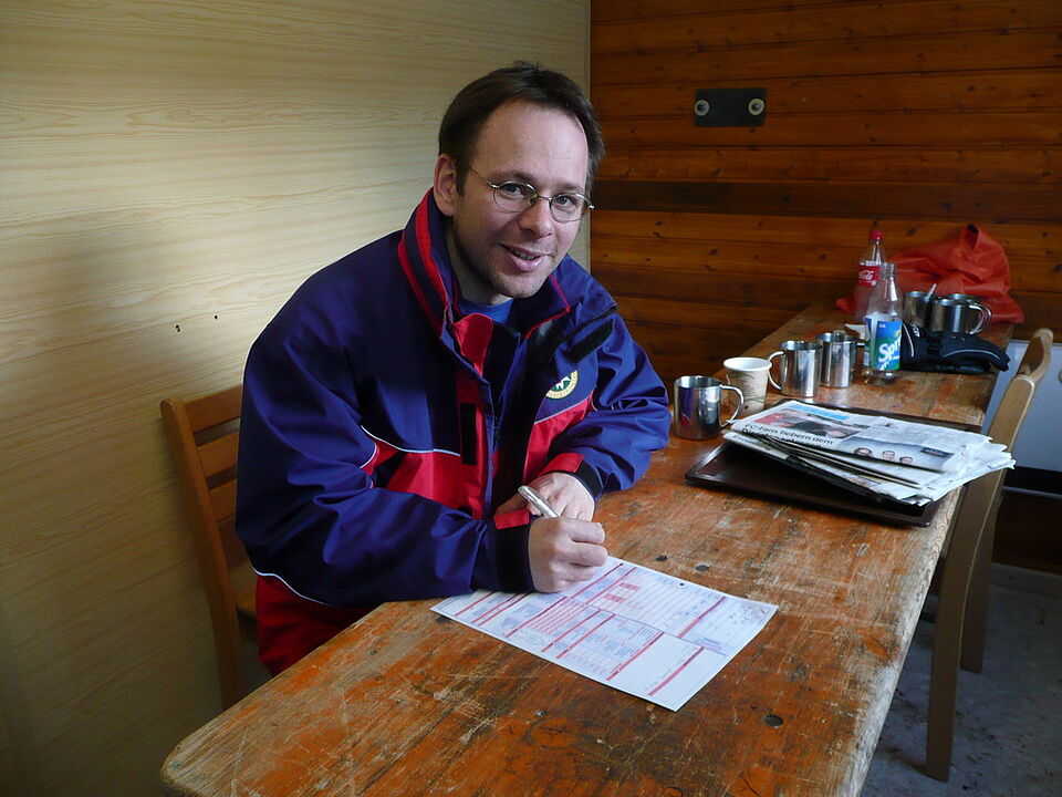 Bild DRK ZR | Thorben Becker, der Bergwachtarzt der Bergwachtbereitschaft Nideggen, beim Ausfüllen der Protokolle. Es waren aber nur kleine Verletzungen zu versorgen. Ansonsten hatten Besucher und Rotkreuzler viel Spaß bei Supersonnenschein.