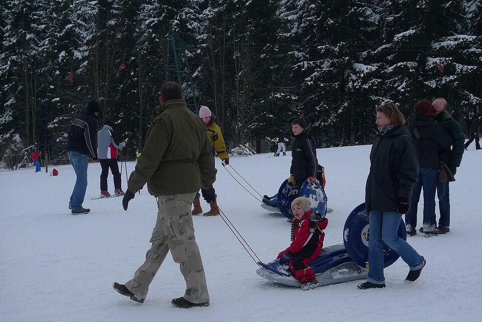 Begeistert fuhren sowohl die kleinen als auch die großen Familienmitglieder auf ihren Schlitten oder Skiern den Hang hinunter.