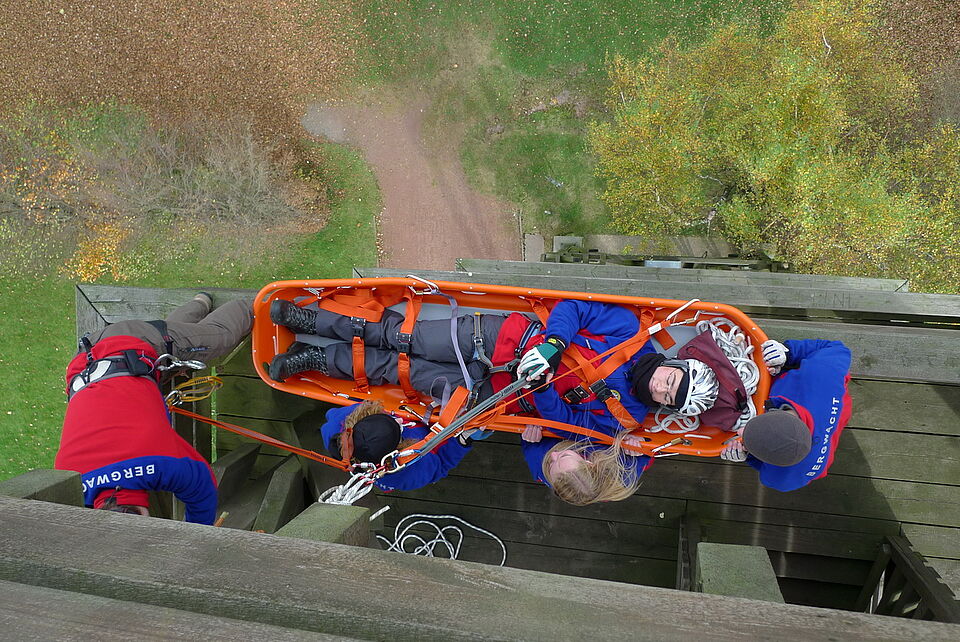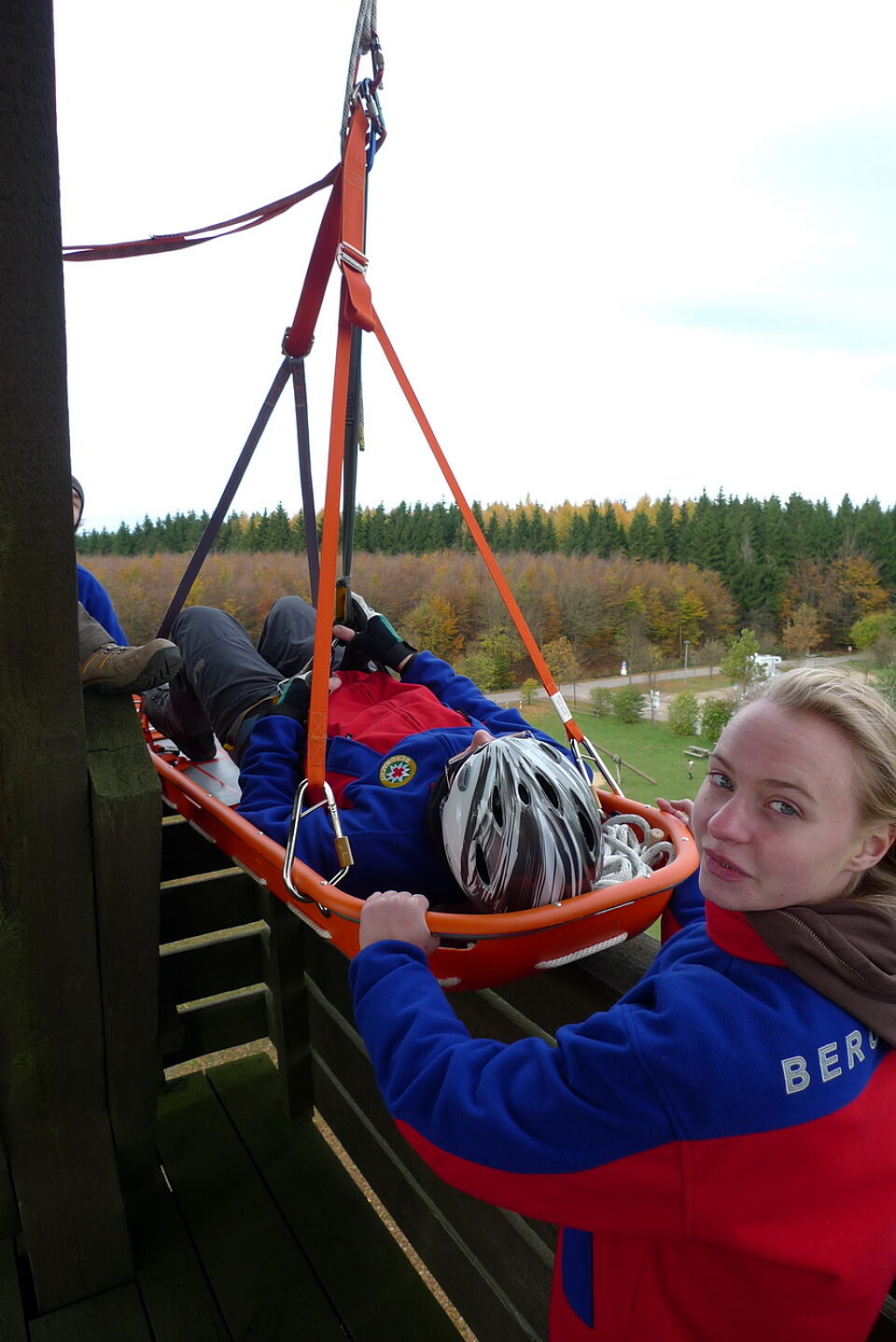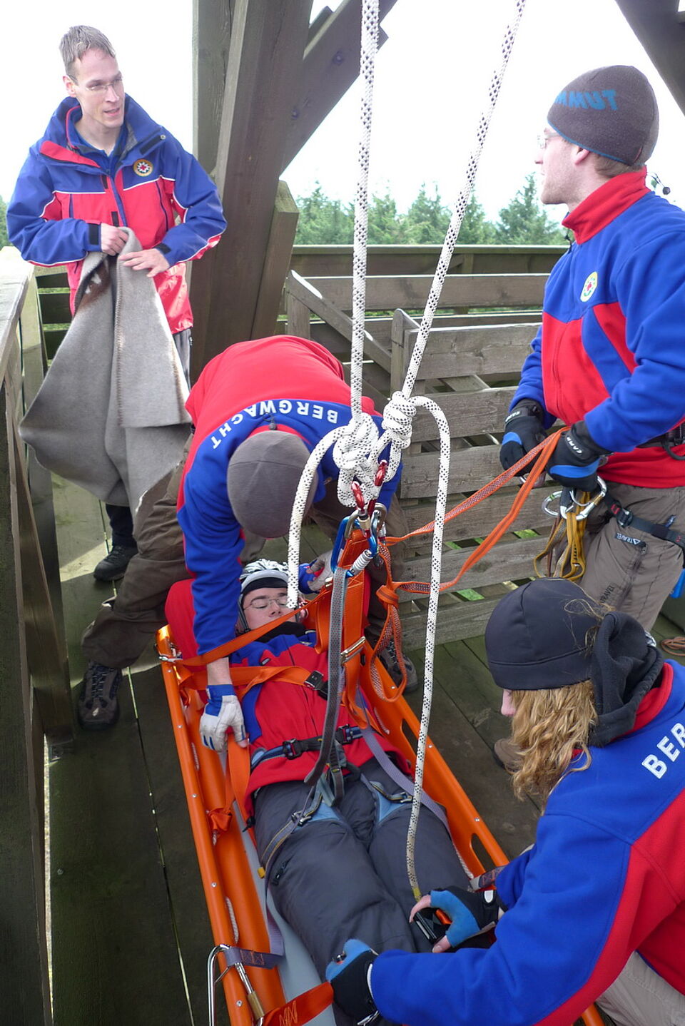 Bild DRK ZR | Auf der obersten Plattform des Udenbrether Turms bereiten die Rotkreuz-Bergwachtler die Rettung eines Verunfallten vor.
