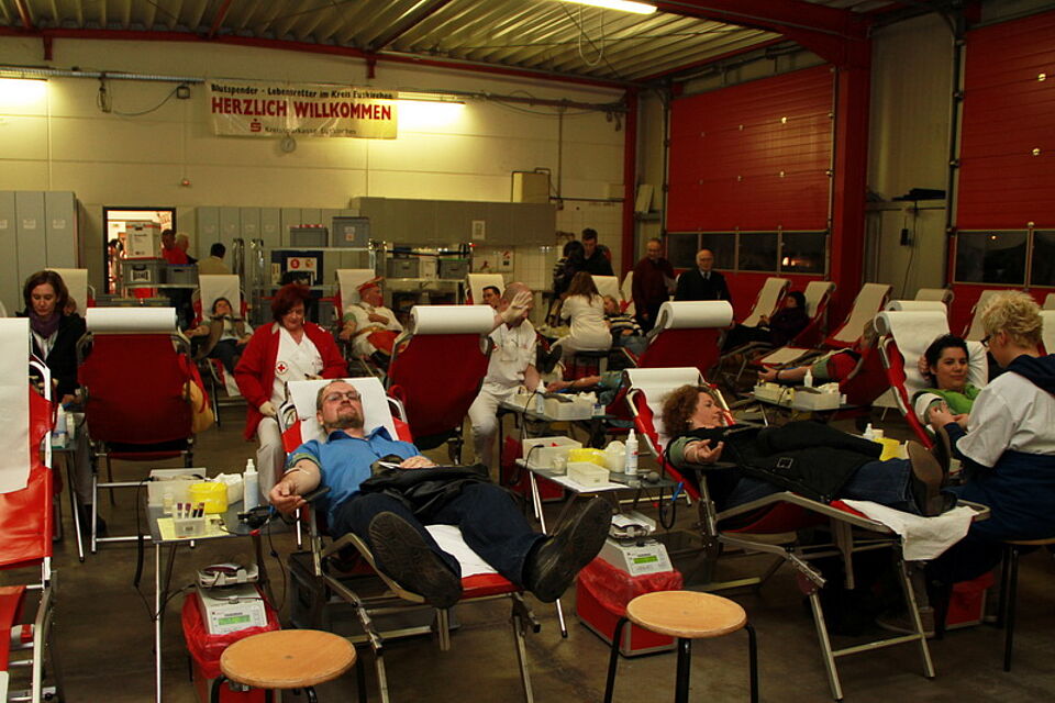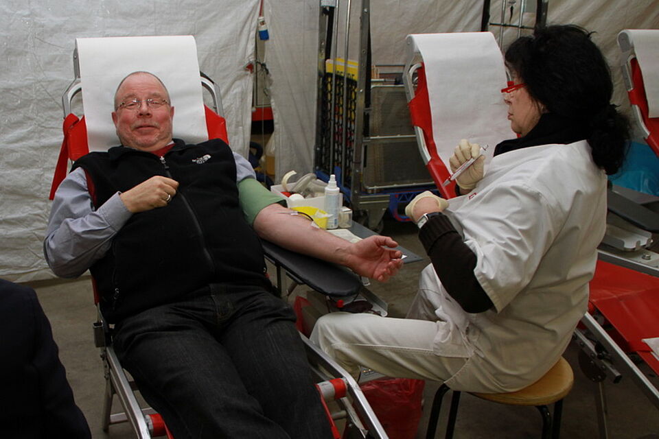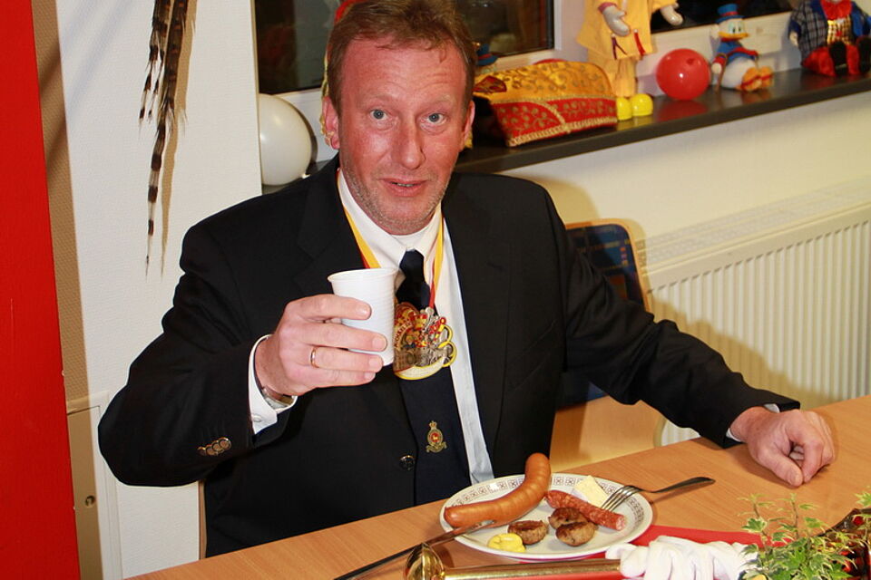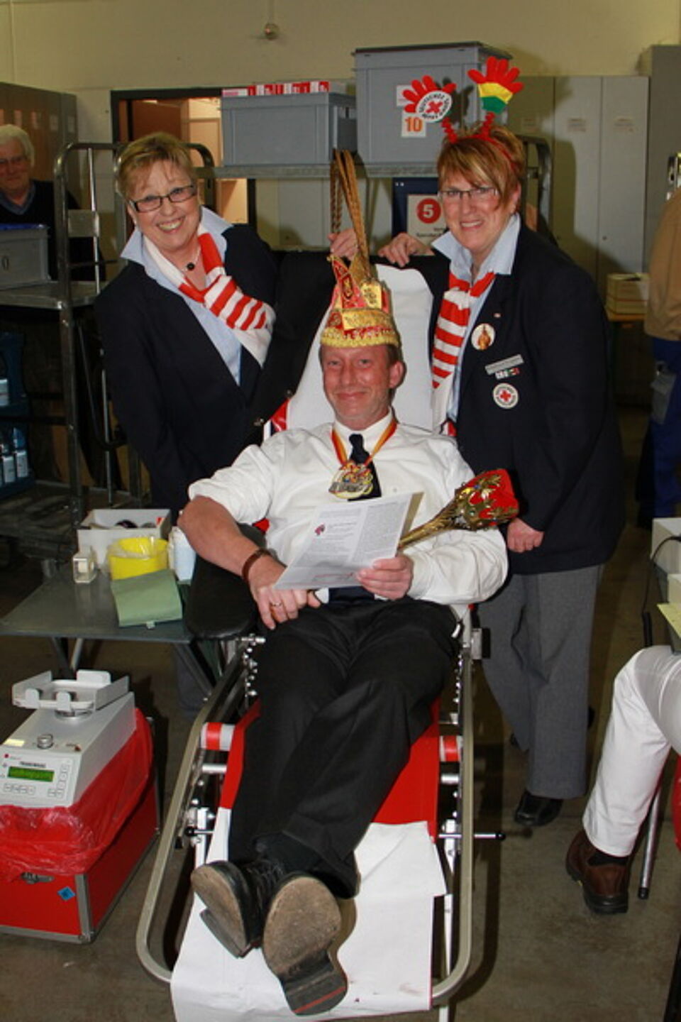 Während aus den Lautsprechern der Wiesnhit 2009 „10 Meter geh, ja mei ist des schee“ ertönte, wartete der Prinz regungslos darauf, dass sich der Beutel neben ihm mit gut 500 Gramm seines jecken Blutes füllte. Anschließend war eine kurze Ruhepause angesagt, denn für den Prinzen ging es danach noch auf drei karnevalistische Termine. Dass er an diesem Abend auf den Sitzungen ein wenig blutleer wirkte, ist eher unwahrscheinlich, denn das Küchenpersonal des Roten Kreuzes hatte wieder einmal bestens gekocht, und so konnte sich der Prinz gemeinsam mit den 253 Bürgern, die seinem Aufruf gefolgt waren, kräftig stärken, bevor es wieder an die närrische Front ging. Übrigens waren trotz des etwas ungünstigen Termins am Freitag 21 Erstspender gekommen. Dies freute die Blutspendebeauftragte Edeltraud Engelen, wenn sie sich allerdings auch noch mehr Spender gewünscht hätte. Im letzten Jahr waren es gut 350. Da fand der Spendetermin allerdings auch am Aschermittwoch statt.