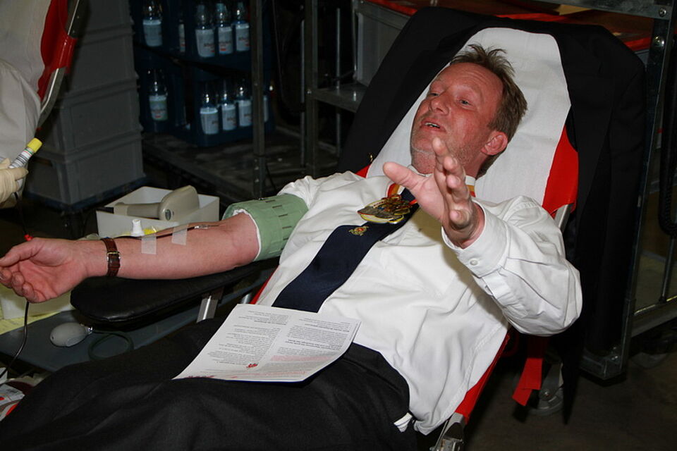 Nach dem Arztgespräch wurde der Prinz von der Ortsvorsitzenden des Roten Kreuzes Euskirchen, Dagmar Harder, und der Blutspendebeauftragten, Edeltraud Engelen, zur Liege gebracht. Prinz Michael IV ließ die Blutabnahme recht geduldig über sich ergehen und lieferte sich mit seinen Begleitern, getreu des diesjährigen Mottos „Et Laache kann os keene vebeede“, zwischendurch einen amüsanten Schlagabtausch. „Warum wird denn jetzt mein Fußteil hochgestellt?“, fragte er beispielsweise. Und Guido Schmitt antwortete: „Weil sie das Blut aus deinen Beinen auch noch haben wollen.“