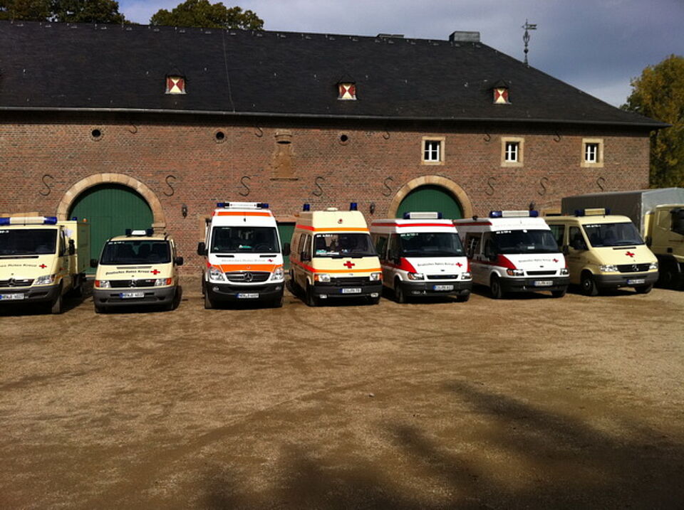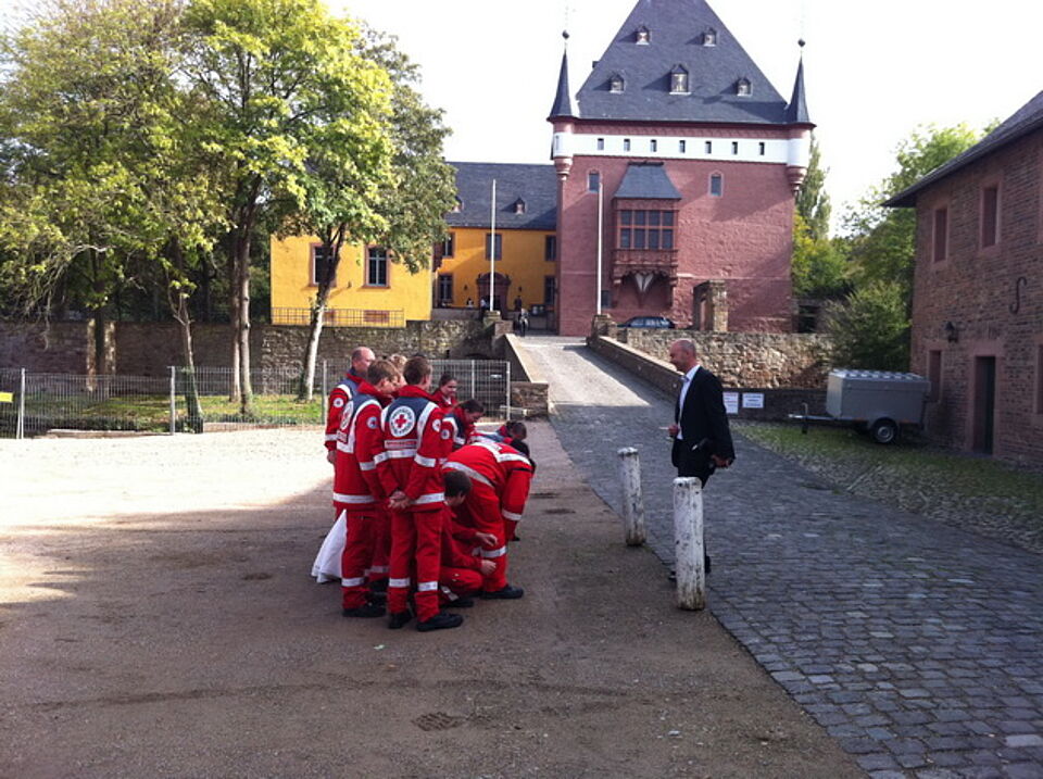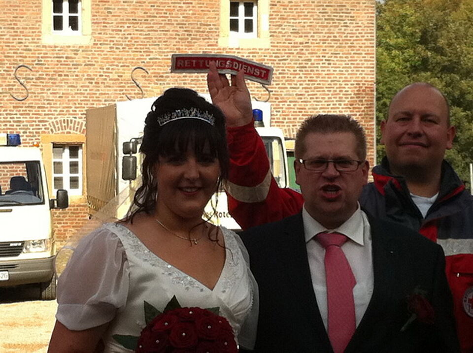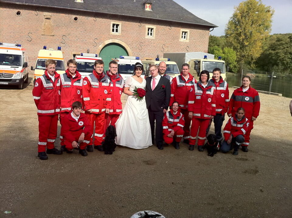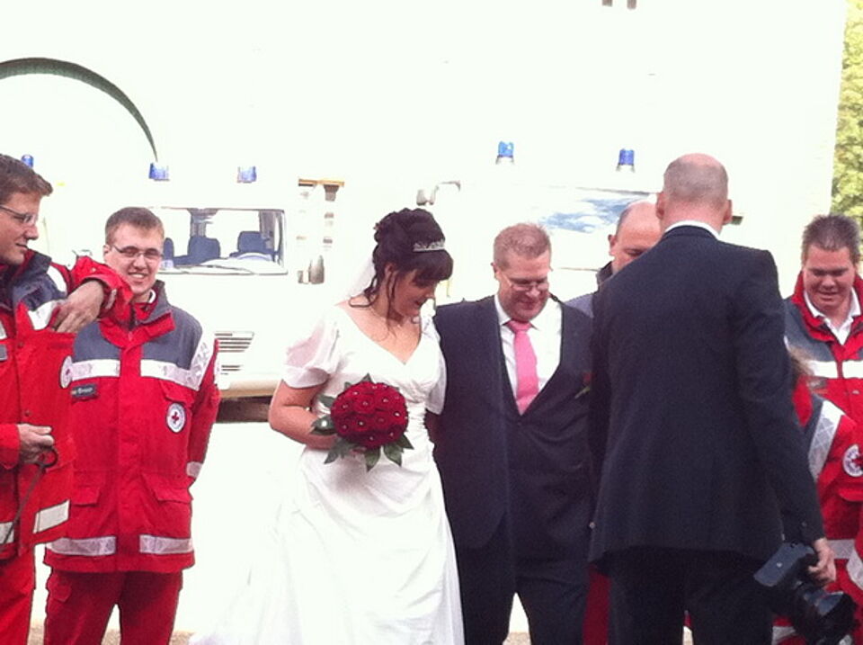 Als das frisch vermählte Paar aus dem Schloss kam, wurde es von einem Blaulichtgewitter und Martinshörnern stilvoll in Empfang genommen. Trotz der Großübung am Kreishaus, fuhr der Ortsverein Kall mit der Einsatzeinheit, einer Abordnung der Wasserwacht, Hundestaffel und des Jugendrotkreuzes nach Niederau.