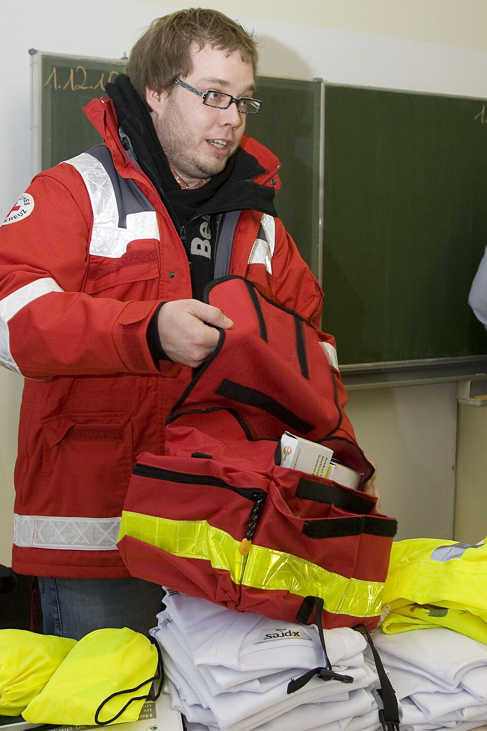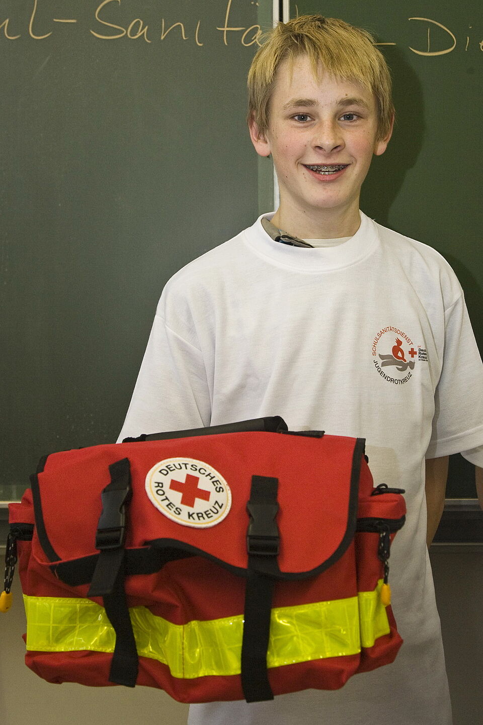 Dazu gehören neben T-Shirts, die die Schüler als Schulsanitäter kenntlich machen, auch ein Türschild für den Sanitätsraum, Ausbildungsmaterialien, Warnwesten und eine prall gefüllte Notfalltasche mit allem, was man für die Erstversorgung braucht.