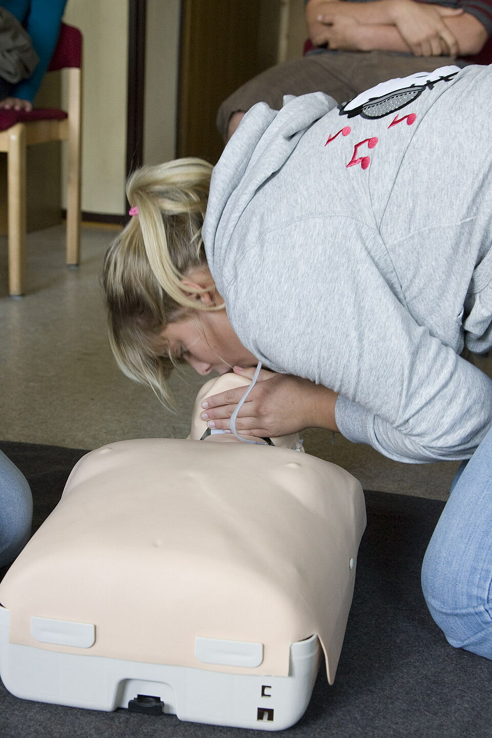 „In den vergangenen Jahren hat sich einiges geändert. Die stabile Seitenlage ist jetzt viel einfacher und sicherer geworden“, berichtete Gaby Gramer, Rotkreuz-Ausbilderin der Gruppe. Auch der Rhythmus von Herzdruckmassage und Beatmungen liegt nun bei 30 zu zwei, außerdem muss nicht mehr lange nach „zwei fingerbreit über dem Rippenbogen“ gesucht werden – es wird einfach eine gedachte Linie „zwischen den Brustwarzen“ gezogen.
