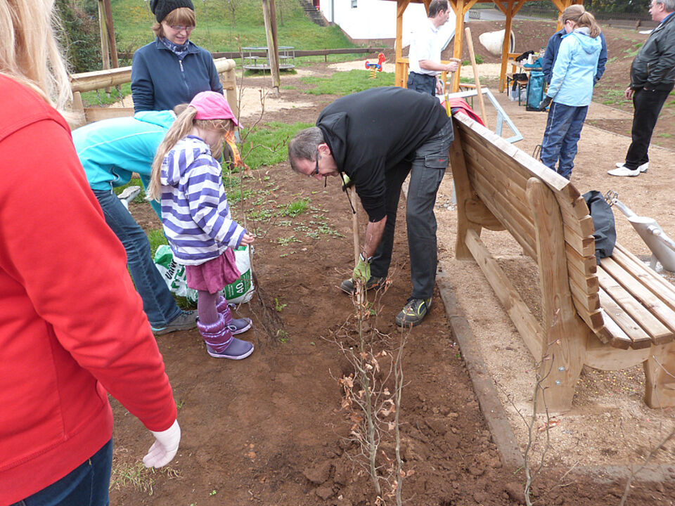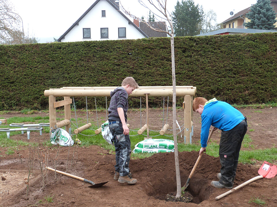 Auf die Einweihung der Fitnessgeräte wollten die beiden Kaller, Elvira Scheuer und Ekkehard Fiebrich, offensichtlich nicht mehr warten. Die beiden ehrenamtlich Tätigen hatten sich am Samstag mit Hacke und Schaufel unter die jungen Leute gemischt und hoben tiefe Löcher für die neuen Bäume aus.
