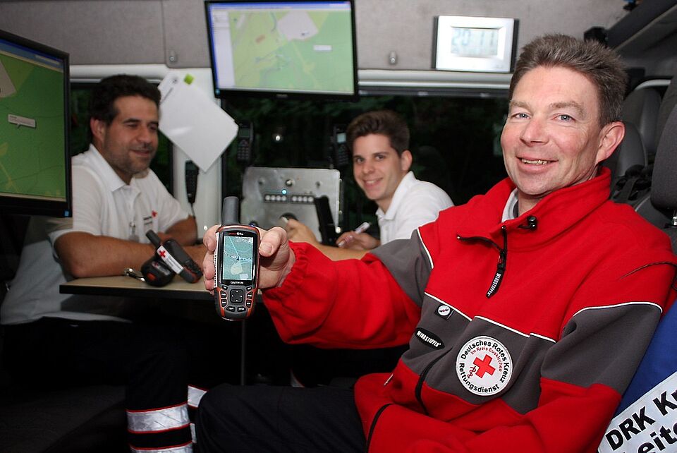 In einem kleinen Waldstück am Rande von Sötenich demonstriert die Rotkreuz-Rettungshundestaffel, wie die neuen Geräte bei der Suche nach vermissten Personen eingesetzt werden. Ein Einsatzleitwagen des Roten Kreuzes im Kreis Euskirchen bezieht Stellung auf dem Gelände. Über einen Computer wird das benötigte Kartenmaterial auf die GPS-Geräte der Hundeführer übertragen. „Früher diente uns zum Teil veraltetes Kartenmaterial zur Orientierung und bei Einsätzen weit über die Kreisgrenze hinaus können wir nicht von jeder Gemeinde aktuelles Kartenmaterial mitführen“, sagt Franz Küpper.