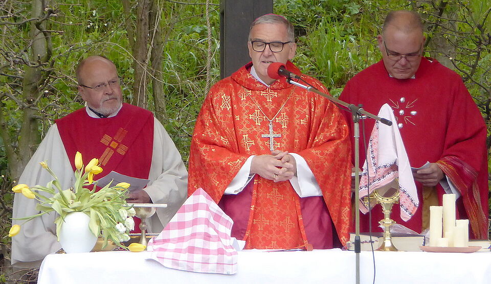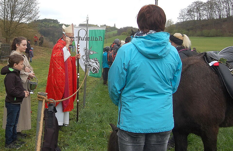Weihbischof Dr. Johannes Bündgens freute sich, erstmals am Kallmuther Maitritt teilnehmen zu können. Obwohl er schon mal als Kind die Ferien bei Onkel und Tante in Mechernich verbracht hatte und später als Heimbacher Pfarrer in einer Nachbargemeinde tätig war, hatte er nie die Gelegenheit, den Kallmuther Ritt mitzuerleben. Er war begeistert im Angesicht der vielen Pilger, die sich trotz der unsicheren Großwetterlage auf den Weg gemacht hatten.