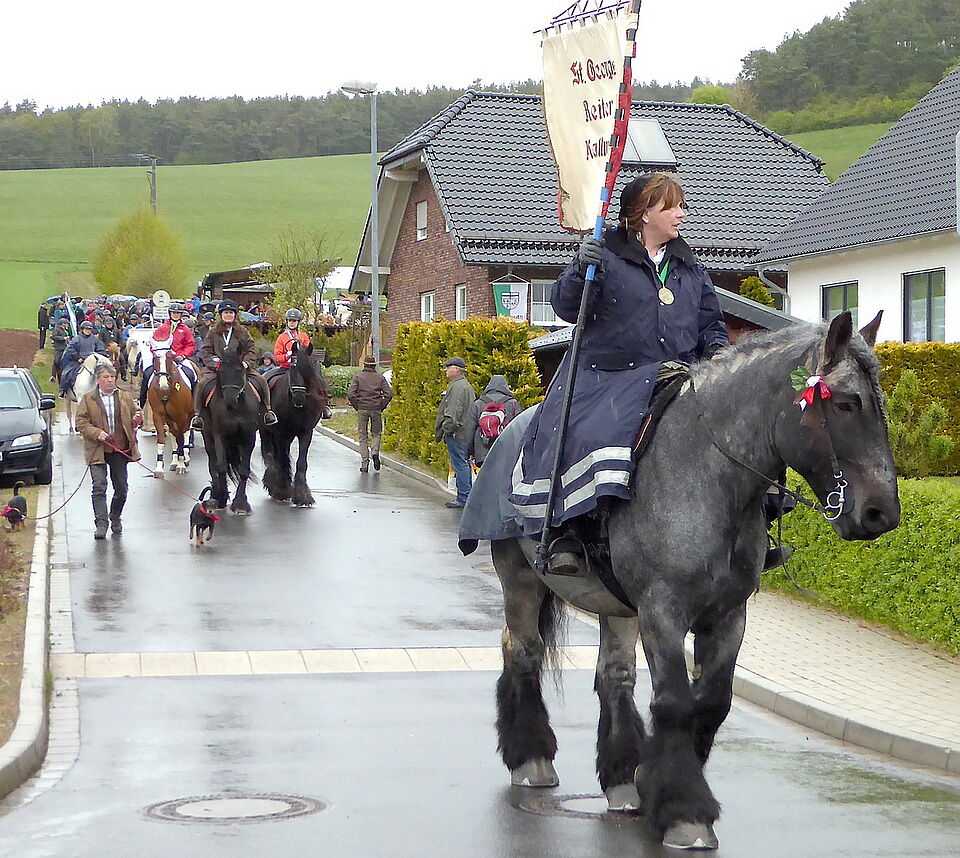 Kallmuth/Kall – „Die Talsohle ist durchschritten, wir sind wieder dreistellig“, freute sich der Kallmuther Ortsvorsteher Robert Ohlerth am Vormittag eines verregneten Maifeiertages. Trotz Wolken und Niesel hatten sich nicht weniger als 103 Reiter und Kutscher und ebenso viele Pferde nach Kallmuth aufgemacht, um an der althergebrachten Reiterprozession zu Ehren des Heiligen Georg teilzunehmen. Hinzu kamen einige Hundert Fußpilger.
