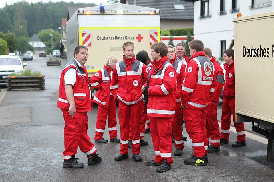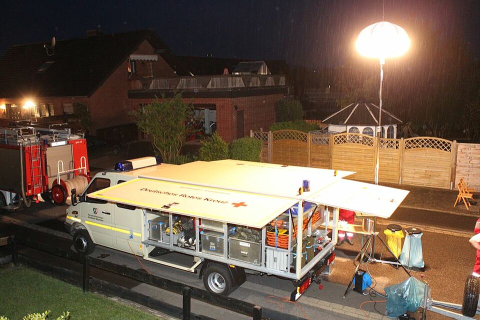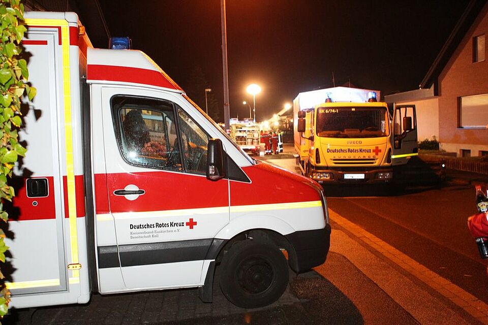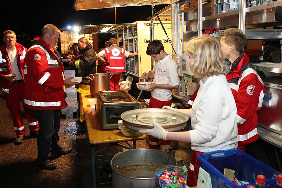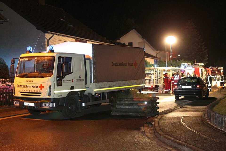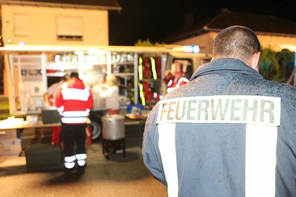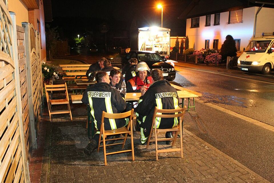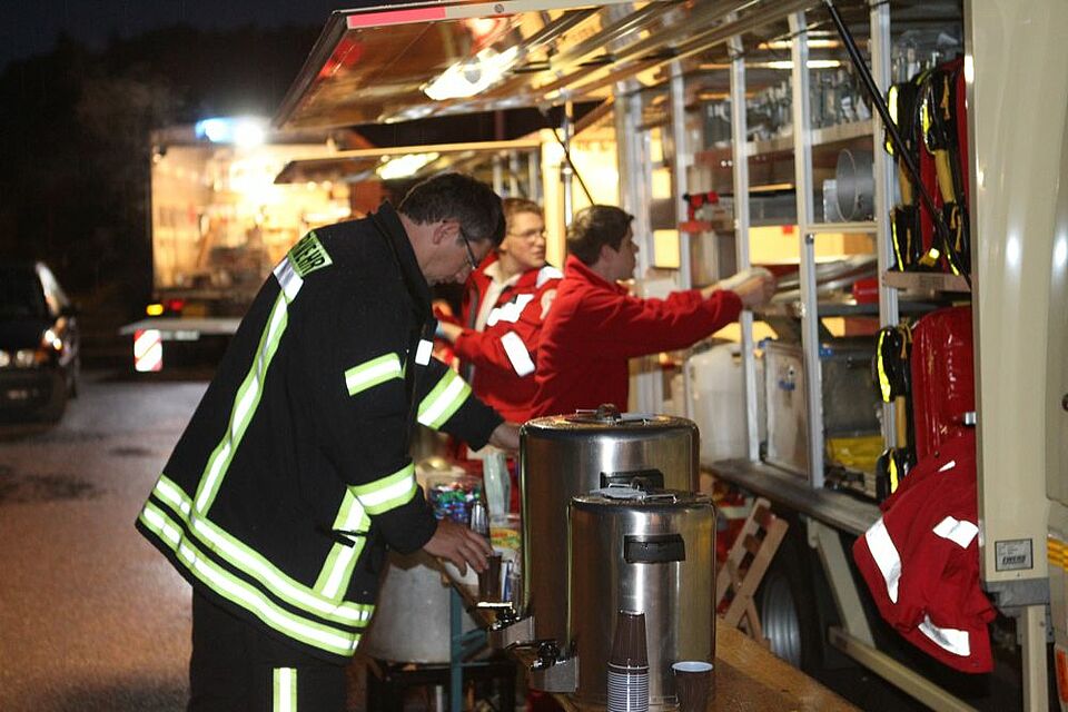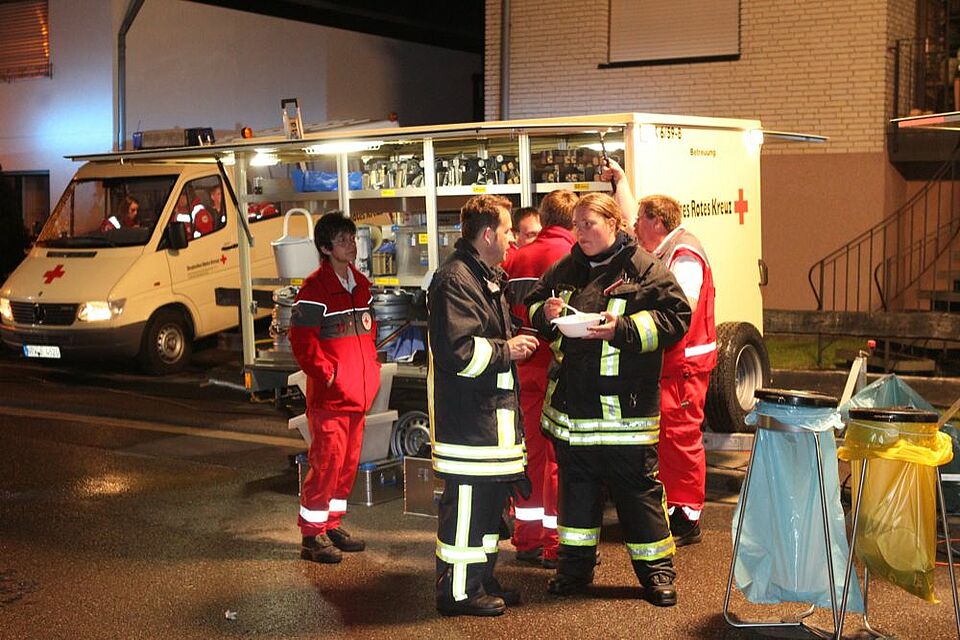 Die Arbeiten der Feuerwehren dauerten die ganze Nacht bis zum frühen Sonntagmorgen an. Ein Trupp des Kaller Roten Kreuzes baute zwischenzeitlich die Verpflegungsstation auf, um die Einsatzkräfte mit warmem Essen, Kalt- und Heißgetränken sowie Süßigkeiten zu versorgen.