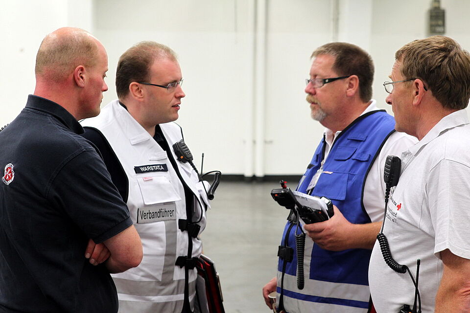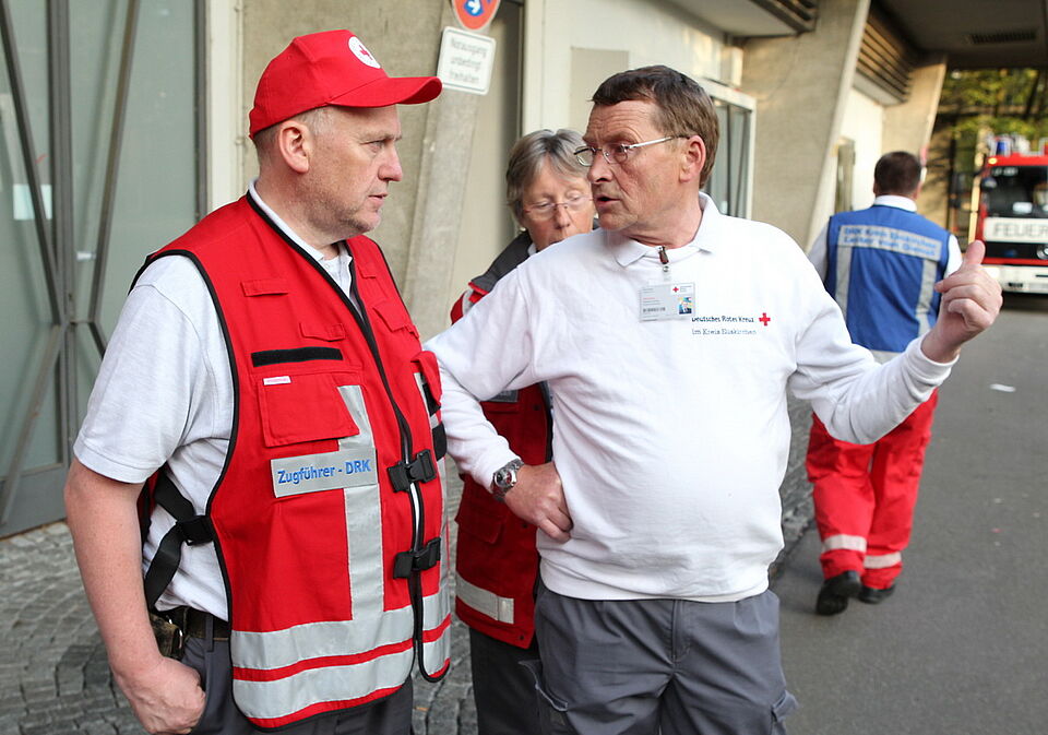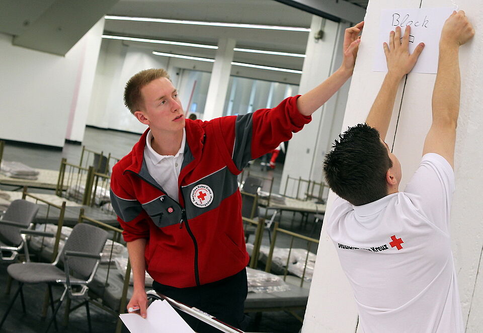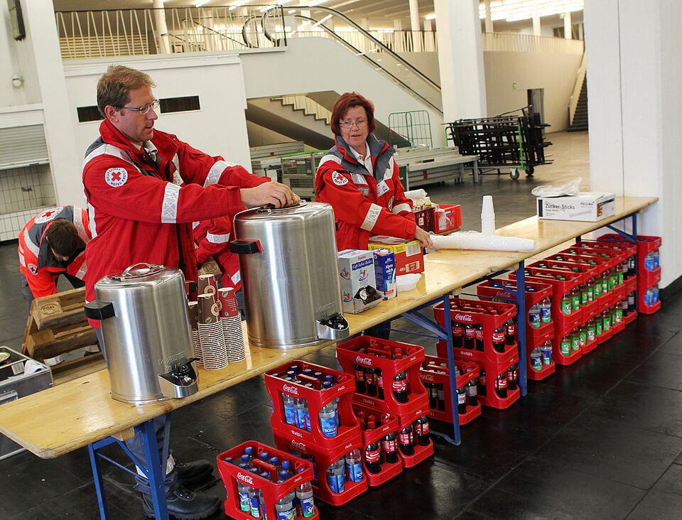 Fast 70 Helfer aus dem Kreis Euskirchen sind unter der Führung von Bert Spilles, Herbert Schmitz und Dirk Kristhal seit zwei Uhr in dieser Nacht im Einsatz. Vom Euskirchener Rotkreuz-Zentrum machten sich mehrere Einsatzfahrzeuge mit Blaulicht auf dem Weg nach Köln-Deutz. Ziel war das Staatenhaus am Rheinufer auf dem Messegelände in Deutz. Dort bauten die Helfer in einer Messe-Halle einen so genannten „Betreuungsplatz 500" auf. Dieser ist so ausgelegt, dass er 500 Nicht-Verletzte kurzfristig unterbringen kann.