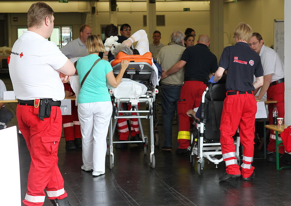 Seit dem Vormittag kommen die Bewohner eines Altenheims, die von der Evakuierung betroffen sind, mit Rettungswagen im Minutentakt am Betreuungsplatz an. Sie werden zunächst registriert und dann einem Bett zugeordnet.