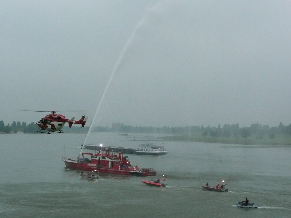 Das inszenierte Unglück: Auf dem Passagierschiff „Wappen von Köln“ ist ein Feuer ausgebrochen, rund 100 Passagiere sind über den Wasserweg zu bergen. Die zahlreichen Schaulustigen in der Altstadt und auf der Deutzer Brücke konnten die Jahresübung von DLRG und Rotkreuz-Wasserwacht bestens beobachten. Auch die Zusammenarbeit mit der Feuerwehr wurde geprobt. Die Wehrleute mussten mit ihren Gerätschaften an Bord gebracht werden, um noch bestehende Brandherde löschen zu können.