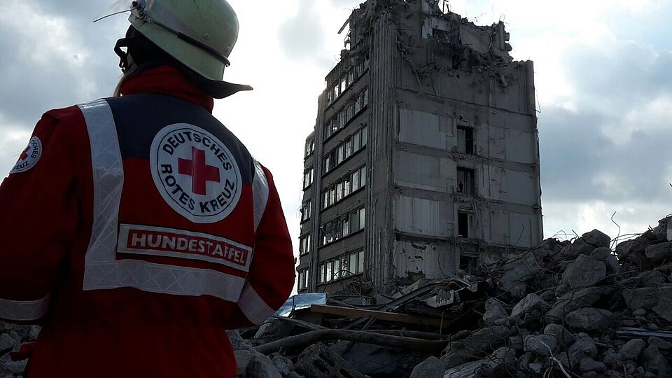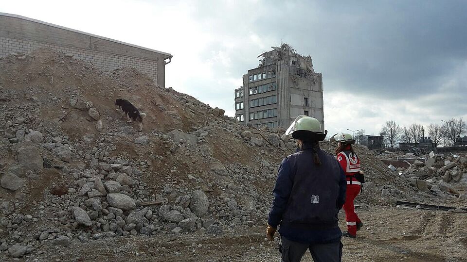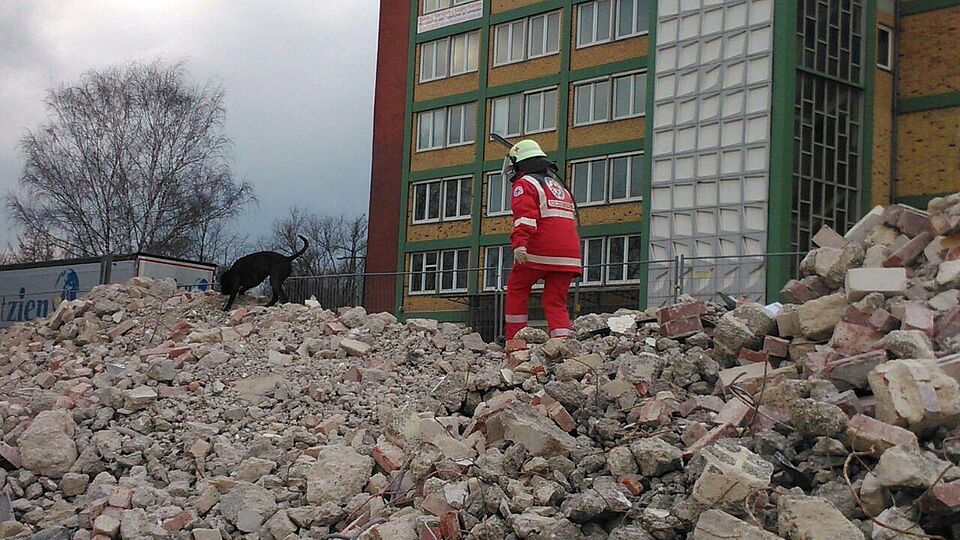Die Suche nach Verschütteten, zum Beispiel nach einem Gebäudeeinsturz, ist eine weitere Suchspezialität der Rotkreuz-Hunde, neben der Suche nach Vermissten in beispielsweise Waldgeländen oder Grünanlagen.