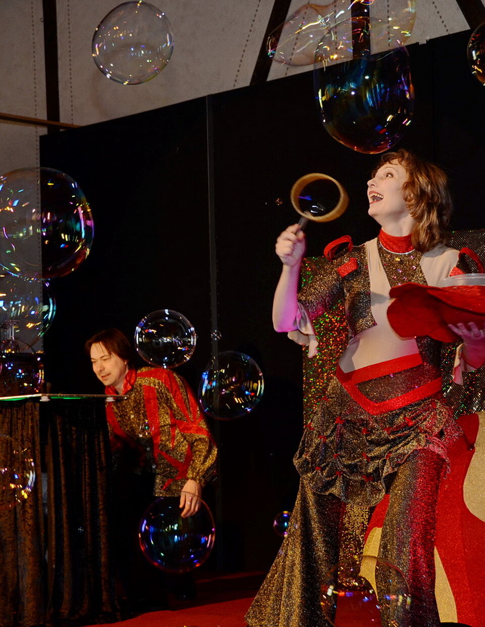 Gilbert schaffte es auch an Ostern 2012 binnen weniger Minuten eine wachsende Menschentraube um seine zwei Quadratmeter große Bühne zu scharen. Während sein Theater die Straße war und ist, brauchen Iryna und Alexander Bilenko Illumination, Windstille, und ein Dach über dem Kopf für ihre zauberhafte Show mit und um Seifenblasen. Der Pingsdorfer Tanzsaal schuf die ideale Umgebung für das aus der Ukraine stammende Artistenpaar wie für die jeweils zwischen 80 und 200 Zuschauer bei ihren märchenhaft schönen Vorführungen.