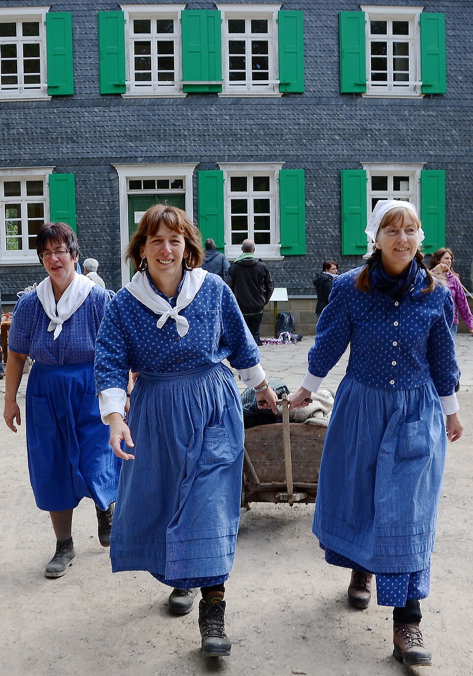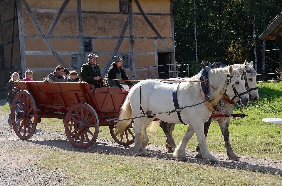 Christian Müller kam mit einem prächtigen Viererzug von Kaltblütern daher, nicht ganz ernst gemeint war die „Westerwälder Quadrille“ als Abschluss im Schauring: Museums-Landwirtschaftsmeister Gerd Linden nahm in einem Leiterwägelchen Platz, die umgedrehte Mistforke wie ein Zepter in der Hand, und vier blaugewandete Museumsbäuerinnen zogen ihn zum Gaudium der Besucher im Kreis herum.