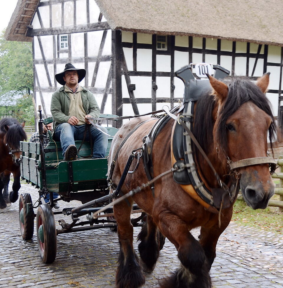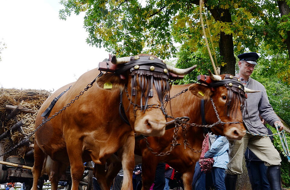 Ein Publikumsmagnet waren nicht nur der Gespannkorso an den Vormittagen der „Tag nach der Ernte“ und die Züge der Oldtimer-Traktoren am Nachmittag, sondern vor allem die Vorführungen tagsüber in der Baugruppe Niederrhein. Da waren Ochsen, Kühe, Esel und Kaltblutpferde bei der Arbeit zu bewundern - und zwar in den unterschiedlichsten Anspannungen, wie sie früher in Gebrauch waren.
