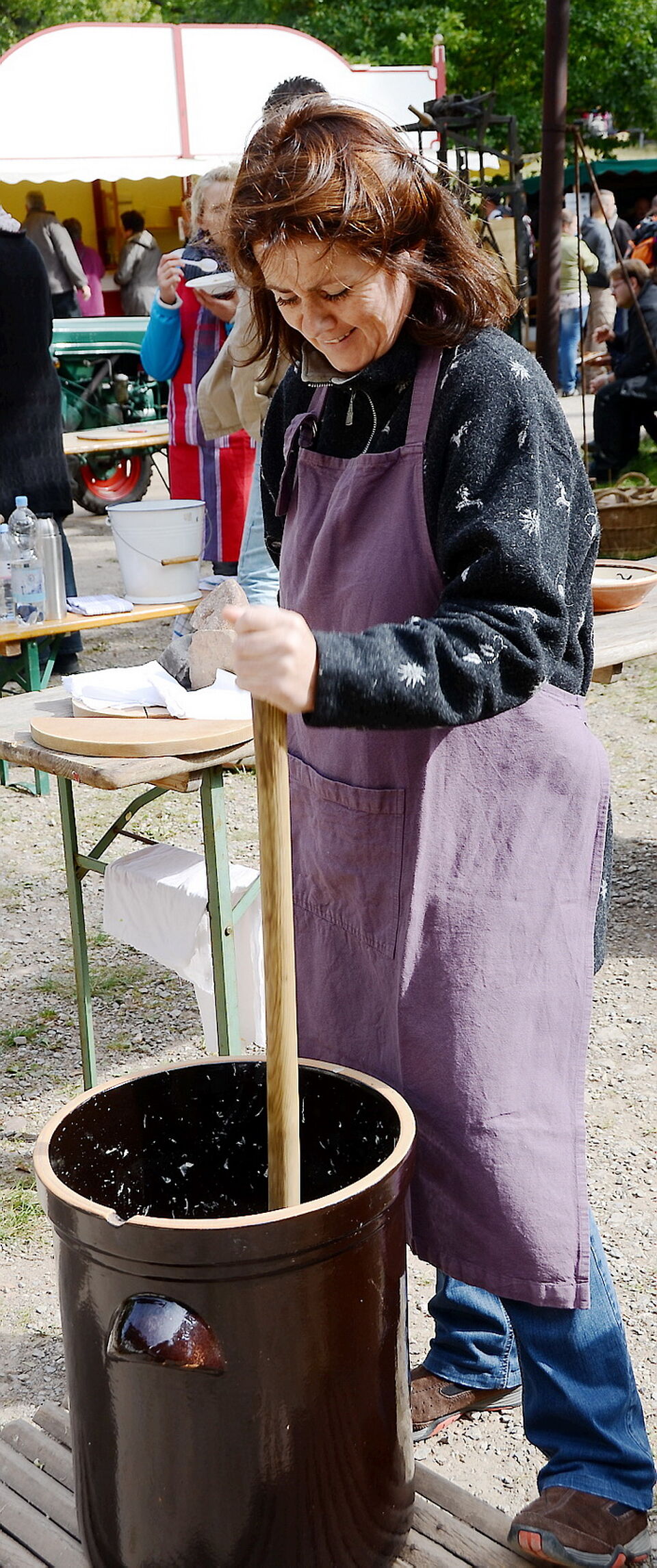Aber es wurde auch Obst und Gemüse eingemacht und gedörrt, zu „Suurem Kappes“ gestampft oder zu „Suur Bonne“ in Steinguttöpfen eingelegt. „Braune“ Feldarbeit mit von Pferden und Ochsen gezogenen Pflügen, Grubbern und Eggen wurde vorgeführt.
