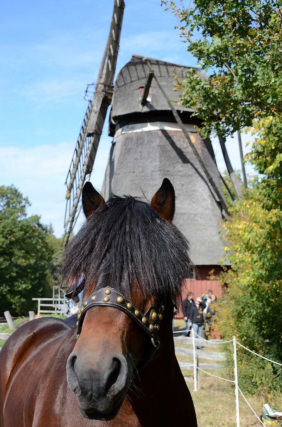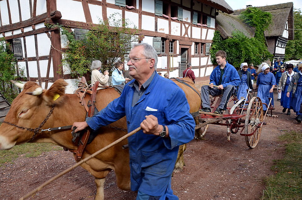 So konnten die Besucher des Freilichtmuseums lernen, wie man früher Garben band und aufstellte, sie konnten „Kappes“ stampfen, Sensen dengeln und bei der Gewinnung von Leinen aus der Flachspflanze mithelfen. Es wurde aber auch viel dörfliches Handwerk wie Dacheindeckung mit Reed, das Beschlagen der Arbeitspferde, der Mühlenbetrieb oder Korbflechten demonstriert. Auch die vierbeinigen Helfer, ohne die alles noch viel mühseliger gewesen wäre, kamen zu Ehren: schwere Kaltblut-Pferde und Zugochsen. Etwa 45 Rösser und Ochsen bildeten einen stattlichen Korso, der vom Pingsdorfer Tanzsaal zur Baugruppe „Niederrhein“ zog.