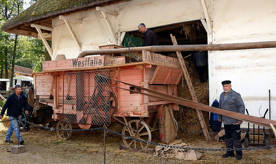 Was dort erlebt werden konnte, waren jene wegen ihrer nicht mehr für möglich gehaltenen Normalität anfallenden Arbeiten in Haus und Hof, die ehedem nach Einbringen der Ernte getan werden mussten. Im LVR-Freilichtmuseum Kommern wurde einmal mehr Getreide geerntet, eingefahren und gedroschen. Und zwar nach unterschiedlichen Verfahren mit Flegel, Windfege und vergleichsweise moderner Dreschmaschine plus Ballenpresse.