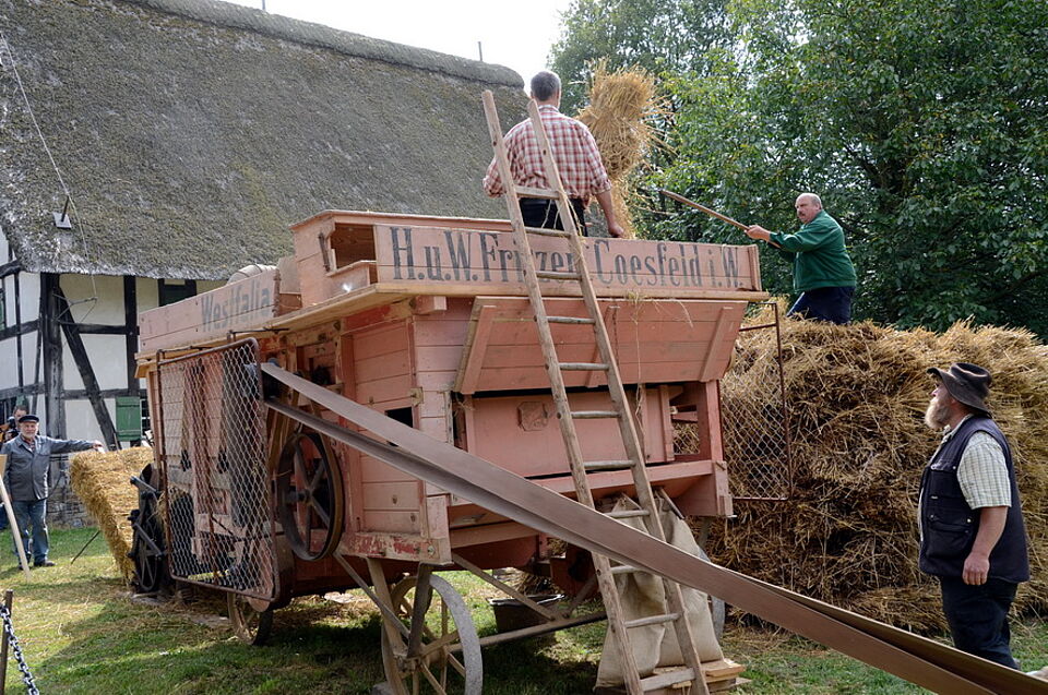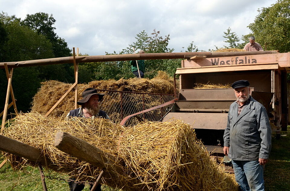 Der Getreidedrusch wurde sowohl mit dem Dreschflegel als auch mit der modernen, über Transmissionsriemen vom Traktor angetriebenen Dreschmaschine vorgeführt. Aber auch die Flachsverarbeitung und das gewerbsmäßige Garnbleichen gehörten mit zum Repertoire. Den Zuschauern gaben Fuhrleute, Landarbeiter und Bäuerinnen sachkundig Auskunft, wie der Luxemburger Bio-Bauer Nico Hamen, der erzählte, wie seine Großeltern noch mit zwei Pferden und vier Milchkühen ihren Lebensunterhalt bestreiten konnten. Im großen Korso von Oldtimer-Traktoren und Landmaschinen, die hupend und knatternd über das Museumsgelände fuhren, gab es für Liebhaber viele „Schätzchen“ der Marken Lanz, Fendt, Deutz und Allgaier zu entdecken. Veranstaltungsorganisator Dr. Michael Faber und sein Team hatten an zwei Tagen wieder ein vielfältiges Programm zusammengestellt, bei dem die Museumsbesucher nicht nur Zaungäste waren, sondern hier und da auch mit anpacken konnten, etwa beim „Kappes einmachen“ oder beim Trennen von Körnern und Spelzen mittels einer „Fauche“.