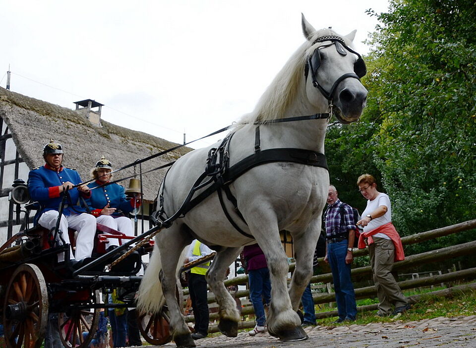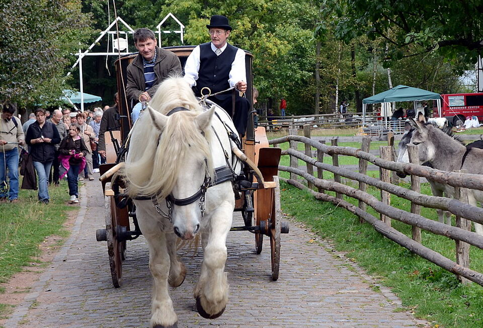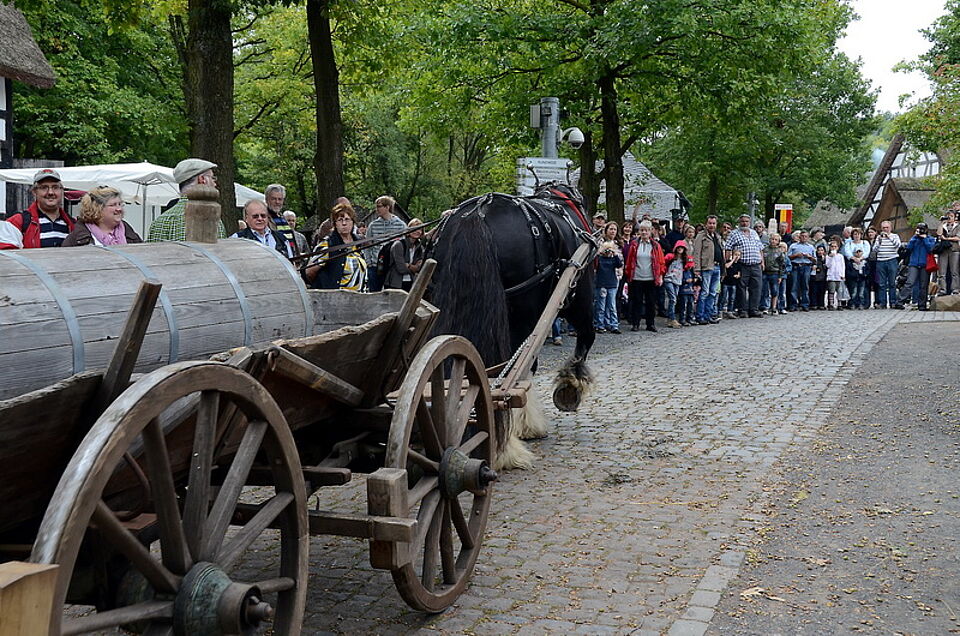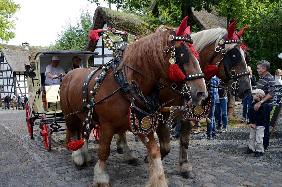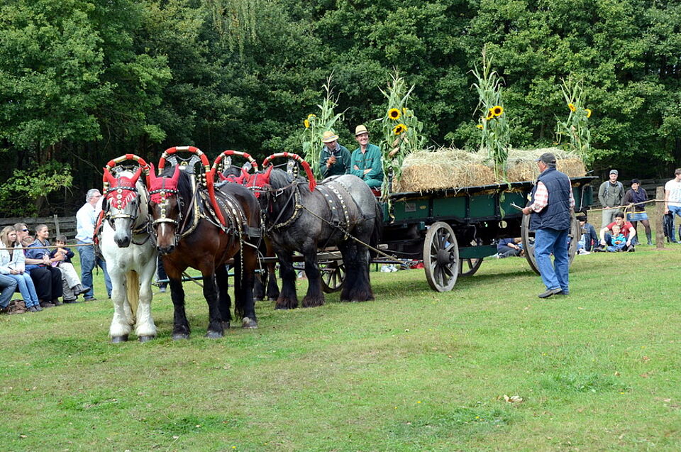 Eröffnet wurde das Programm an beiden Tagen mit dem großen Aufzug historischer Pferde-, Ochsen- und Kuhgespanne. Bäckerwagen, Heuwender, Jauchefass und eine historische Feuerwehr mit pferdegezogenem Spritzenwagen durften nicht fehlen. Auf dem von Josef Stamm sach- und fachkundig moderierten Vorstellungsring oder beim Holzrücken im Museumswald knubbelten sich die Zuschauer. Und sie bekamen eine Menge zu sehen, wie den Viererzug des Rommerskircheners Christian Müller, der auch schon beim CHIO in Aachen und auf dem Münchner Oktoberfest für Aufsehen gesorgt hat.