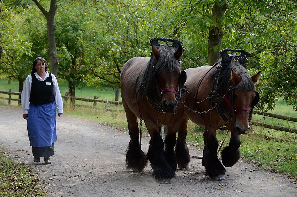 „Wir haben in diesem Jahr ein besonderes Augenmerk auf die Arbeit mit Pferde- und Ochsengespannen gelegt“, sagte Landesmuseumsdirektor Michael H. Faber Medienvertretern. Gleichwohl standen auch Obstdörre, Saftpresse, Flachsbreche und Sauerkraut-Schabe und „Kappesstampfer“ nicht still. Denn: Die Frauen hatten früher nach der Ernte ganz besonders ihren „Mann“ zu stehen. „Nach der Ernte“ ist eine der erfolgreichsten Großveranstaltungen des Kommerner Freilichtmuseums – und hat sich am Wochenende auch in Konkurrenz zu einer ganzen Reihe anderer Events im nahen Umland publikumsmäßig bewährt.