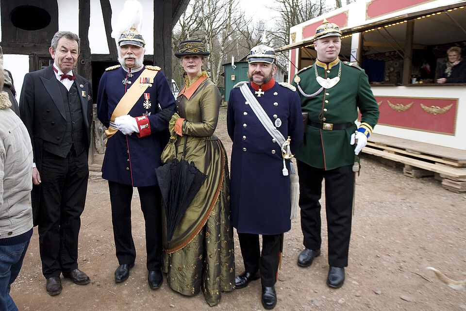 Mit dabei ist nicht nur Kaiser Wilhelm als historisch gekleideter Schauspieler der gespielten Geschichten. Auch weitere Akteurinnen und Akteure der historisch geschulten Gruppe „Facing the Past“ haben für den Jahrmarkt neue Spielszenen einstudiert.