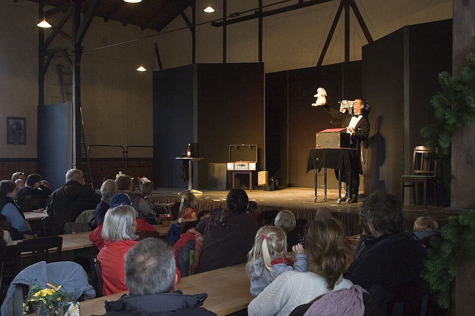 Im Pingsdorfer Tanzsaal lässt „Filu“ komödiantische Illusionen im Stil der 20er Jahre auferstehen und mit der „Laterna Magica“ wird der Vorläufer des Kinos im Freilichtmuseum lebendig, begleitet von Grammophon-Musik.