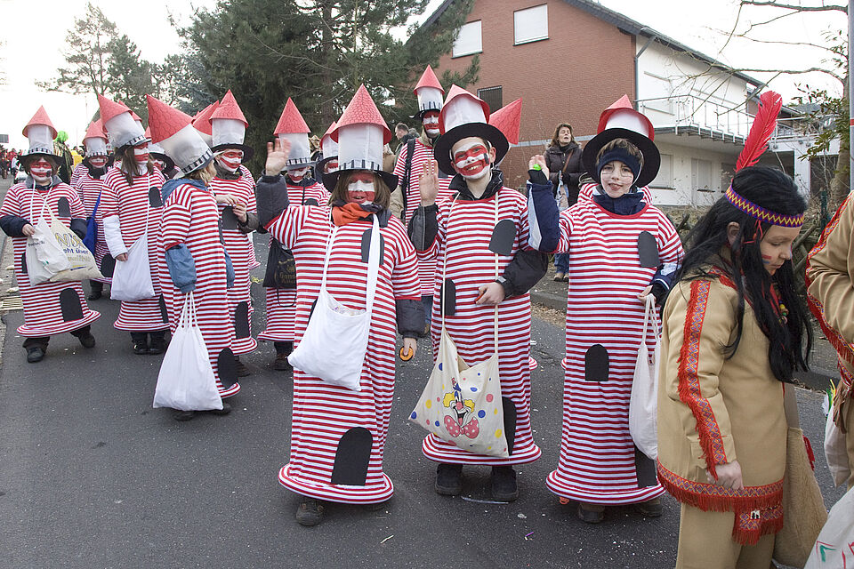 Nicht nur Kamelle und allerlei Süßes, sondern auch Stofftiere brachten derweil die „kleinen Narren“ unter die Leute. Schauerliche Vampire und Geister, wilde Kindergarten-Tiger, echte Zwerge mit unechten Bärten und Nachwuchs-Rockstars mit aufblasbaren Gitarren zogen zur Musik von Tambourcorps Kommern, Musikverein Hahn aus Scheven-Wallenthal, „Vielharmonie“ unter der Leitung von Hubert Lock und der Turmhof-Gymnasium-Big-Band durch die vielen Straßen und Gässchen Kommerns.