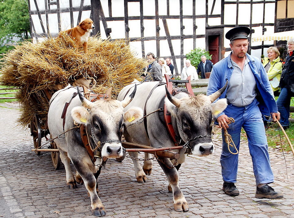 Jeder bleibt im Schnitt fünf Stunden lang, ein Riesenkompliment für Museumsleiter Dr. Josef Mangold und seine Mannschaft – Dank an das Rote Kreuz im Kreis Euskirchen, das wie immer über die Gesundheit und Sicherheit tausender Menschen wachte - Ochsen-, Pferde, Kuhgespanne, Lokomobile und alte Trecker zogen Geräte und zeigten Arbeitsweisen aus verschiedenen Epochen.