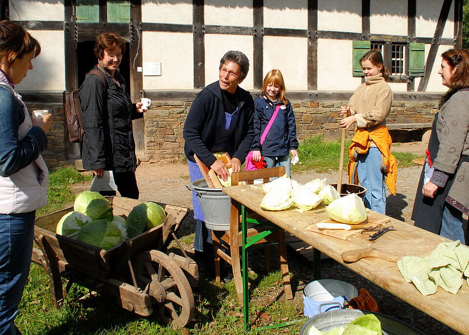 Unser Ehepaar um die 50 hatte im Bergischen Land gerade bei Rosemarie Johnen frische Pflaumen sowie Äpfel und Birnen als Dörrobst gekostet - und bei Anita Wolfgarten und Sabine Roggendorf frisch gebackene Hefepfannkuchen mit Apfelstücken. Anschließend stillten die beiden bei Johanna Hilger und Josefine Sievernich ihren Wissendurst und ließen sich ausgiebig erklären, wie früher „Kappes“ und „Schavour“ für den Winter haltbar gemacht wurden.