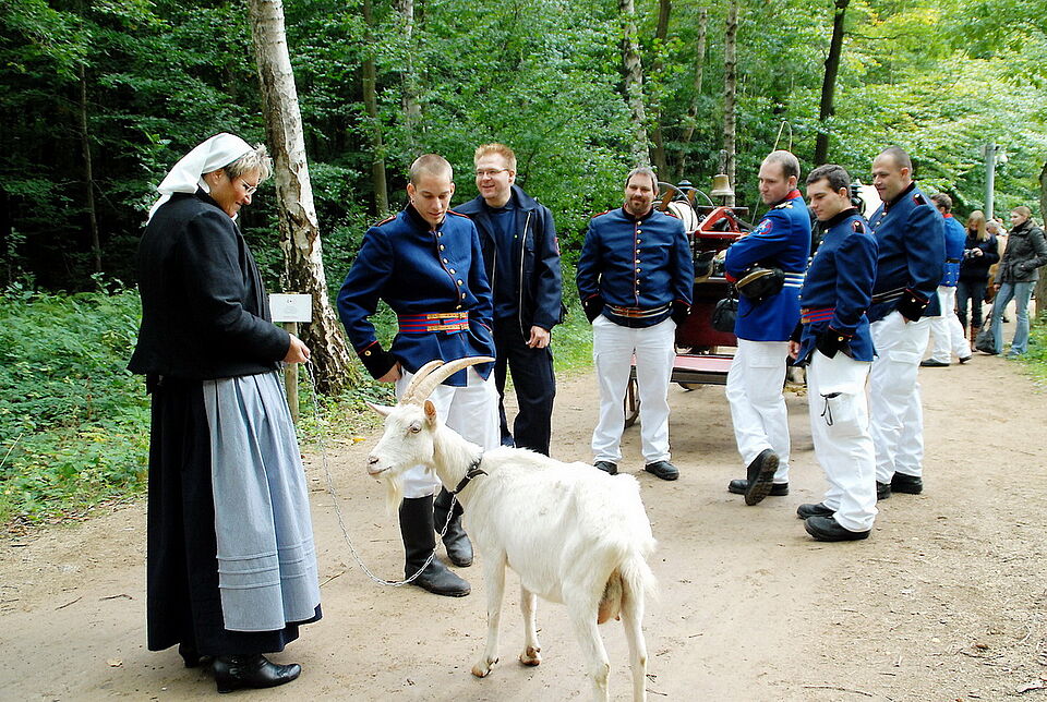 Auch im Wald und auf den großen Wiesen der Baugruppe Niederrhein wurden Tiere und Maschinen im Einsatz gezeigt. Inklusive eines Strohmietenbrandes, den die historische Feuerwehr aus Stommeln und Pulheim löschte und dabei die Besucher eine Eimerkette für den Löschwassertransport von der Pumpe zum Brandherd bilden ließ.