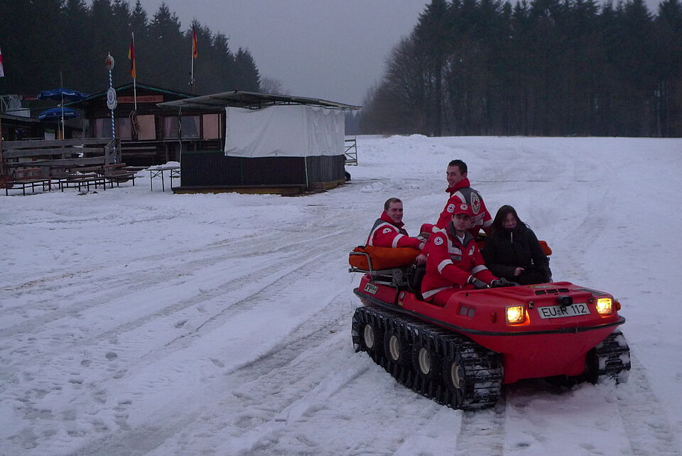 Hinzu kommt der Winterdienst der Euskirchener Rotkreuz-Bergwacht in den Wintersportgebieten der Gemeinde Hellenthal. Im eigens dafür ausgebauten Bauwagen stehen die Bergwächter den Wintersportlern zur Verfügung, um bei einem Notfall auf den Pisten und Loipen rund um den Weissen Stein schnell eingreifen zu können.
