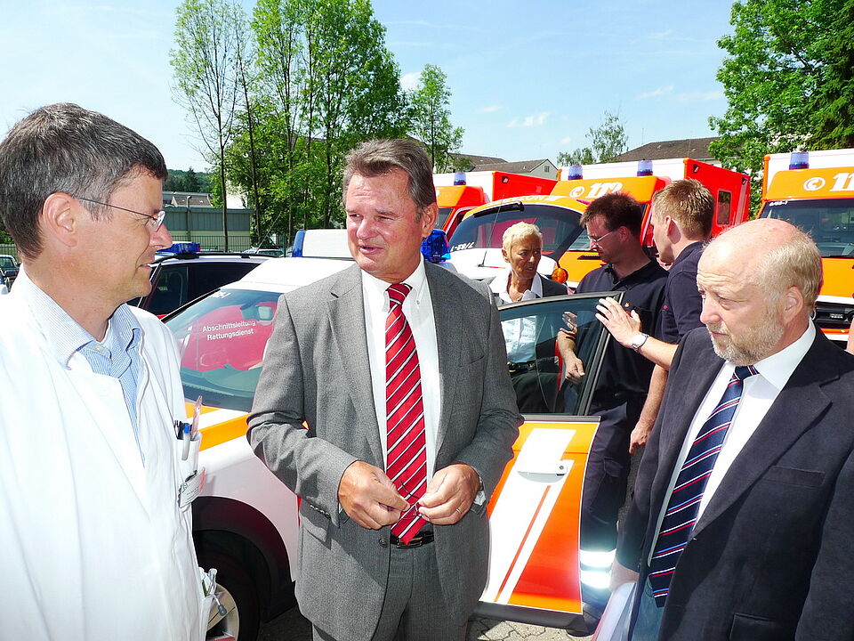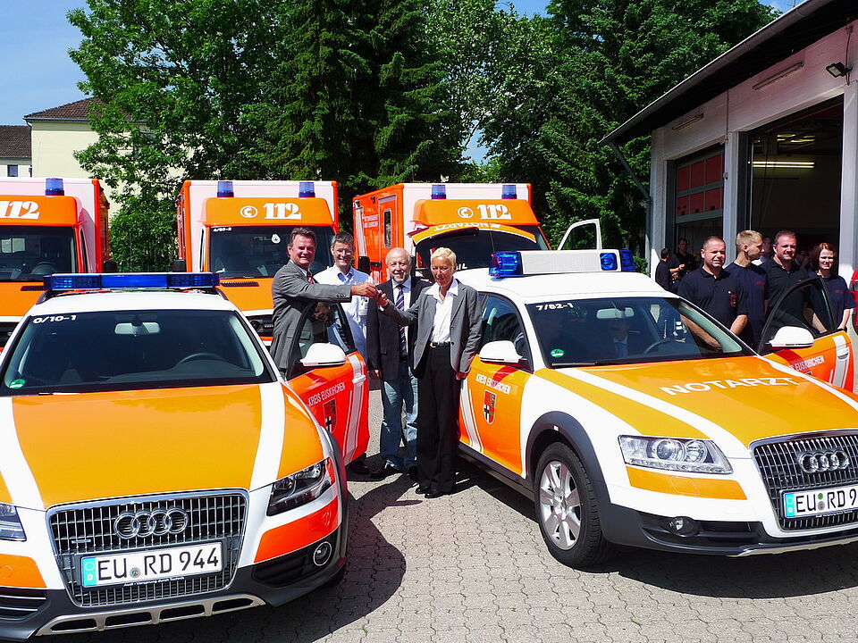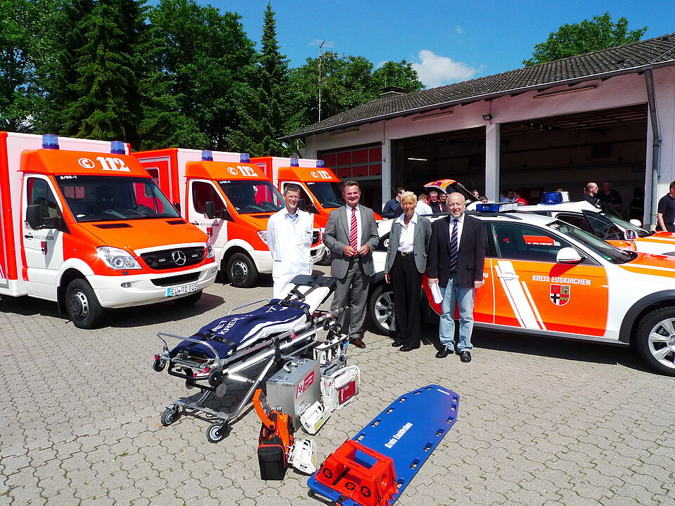Gemeinsam mit Dr. Rudolf Hering, dem Chefarzt der Anästhesiologie und Intensivstation im Kreiskrankenhaus Mechernich, Heinz Rosell, dem Geschäftsbereichsleiter der Kreisverwaltung, und dem zuständigen Amtsleiter Udo Crespin konnte Dr. Gisela Neff, die ärztliche Leiterin des Rettungsdienstes im Kreis Euskirchen, den symbolischen Schlüssel aus der Hand des Landrates in Empfang nehmen.