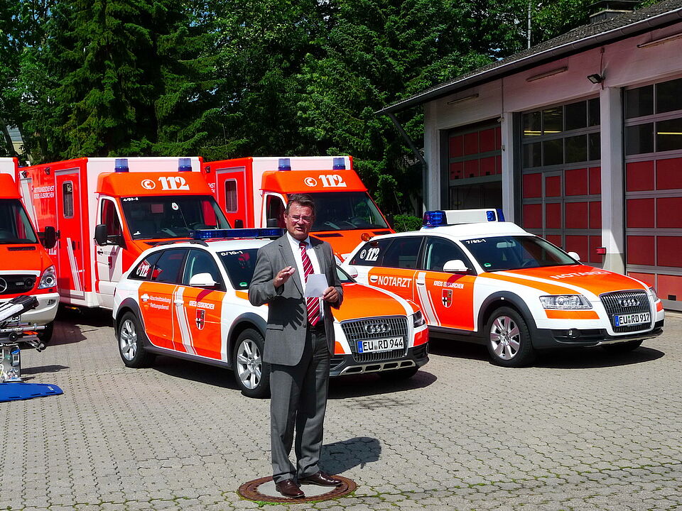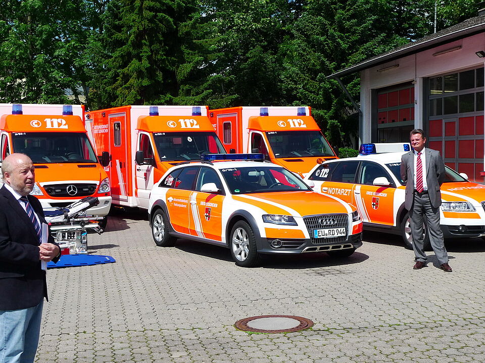 Fünf neue Rettungsdienstfahrzeuge, drei Rettungswagen für die Rettungswachen Tondorf, Rescheid (Rotes Kreuz) und Euskirchen II (Rotes Kreuz) sowie ein Notarzteinsatzfahrzeug und ein Fahrzeug für die Abschnittsleitung Rettungsdienst konnte er an die Mitarbeiter übergeben.