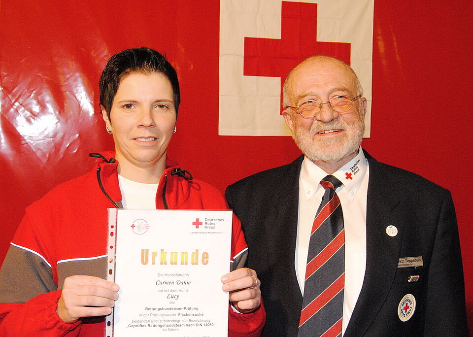 Eine Urkunde überreichte Doppelfeld an Hundeführerin Carmen Dahm von der ebenfalls sehr erfolgreich arbeitenden Rotkreuz-Rettungshundestaffel. Mit Hund „Lucy“ hatte sie erfolgreich die „Flächensuche“-Prüfung absolviert.