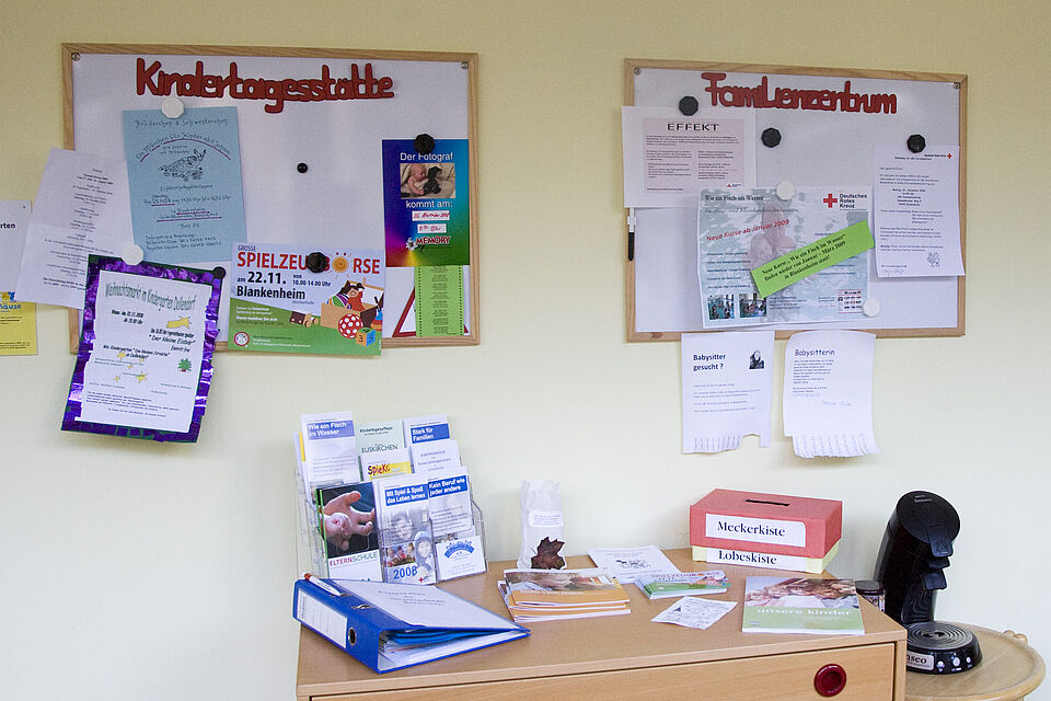 „Wir rücken durch das Familienzentrum näher an die Familien heran“, sagt Sonja Schäfer. Und so gibt es ein offenes Elternfrühstück in der integrativen Blankenheimer Kindertagesstätte. Am Info-Stand liegen direkt neben der Kaffeemaschine zahlreiche Informationen und Broschüren zu Kursen aus. Wenn etwas nicht im Familienzentrum zu lösen ist, vermittelt das Team auch an andere Stellen.