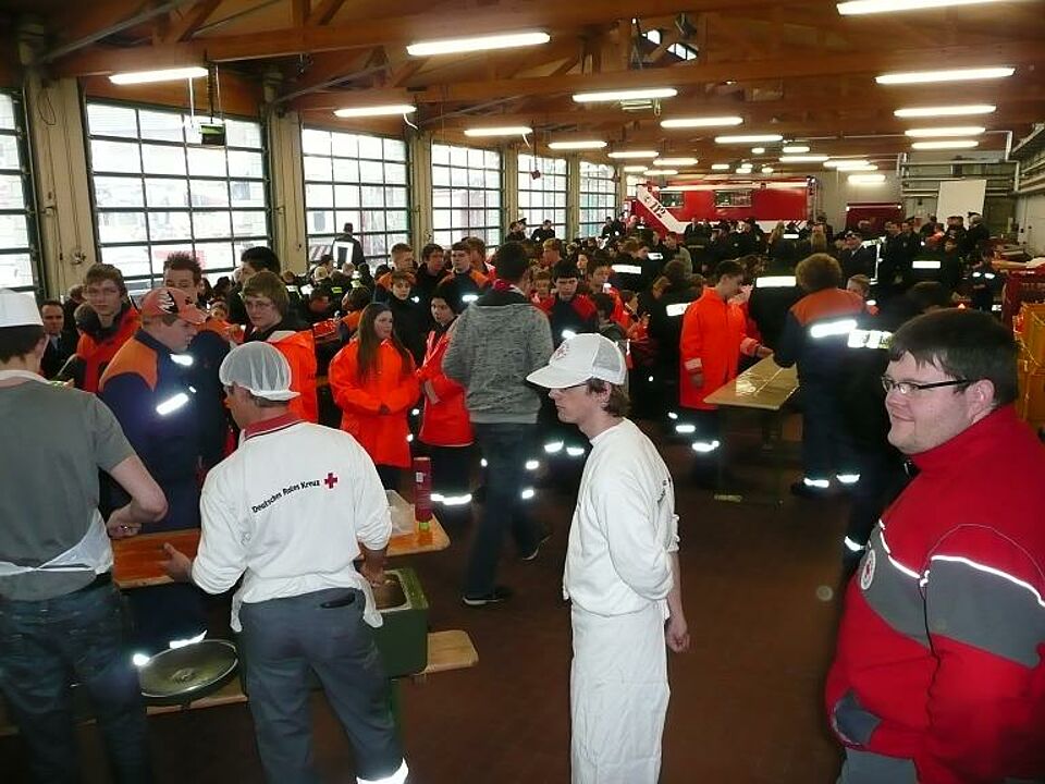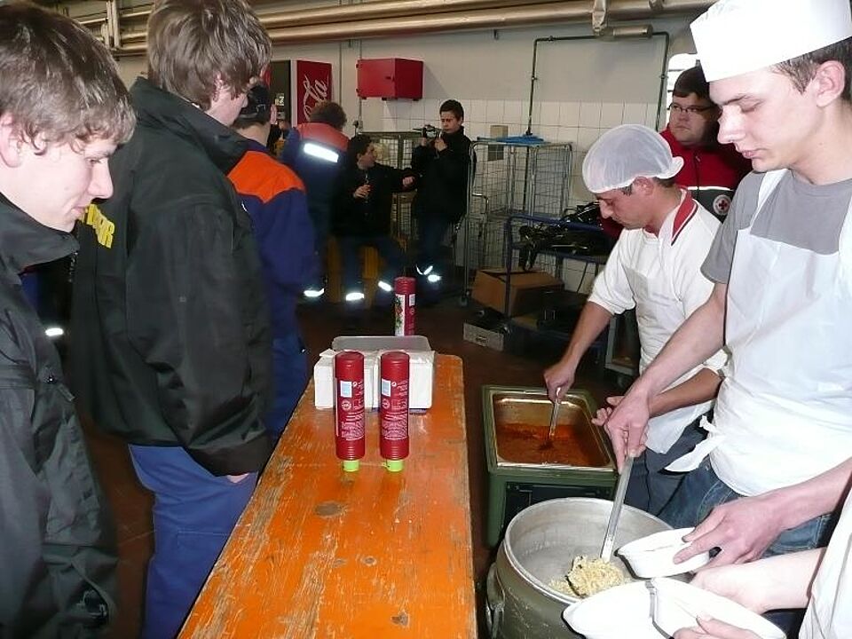 In der hauseigenen Küche der Rotkreuzgemeinschaft wurden 35kg Nudeln und über 30kg Hackfleisch zu einem leckeren Mittagessen für die Jugendlichen verarbeitet. Die zufriedenen Gesichter der Jugendfeuerwehr und ihren Betreuern waren wieder einmal der Beweis für eine gelungene Aktion.