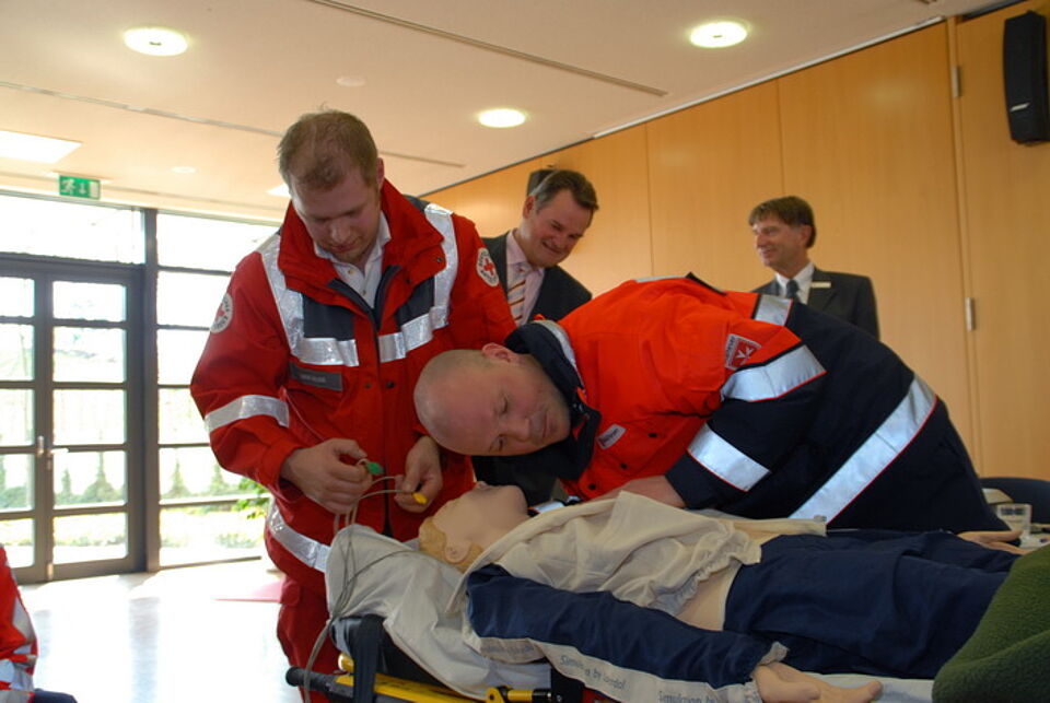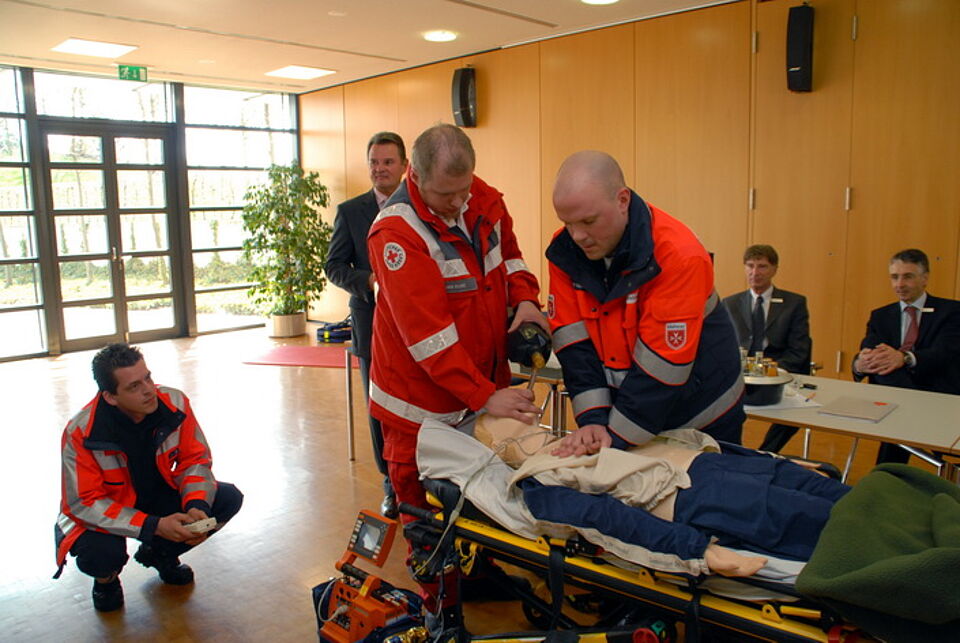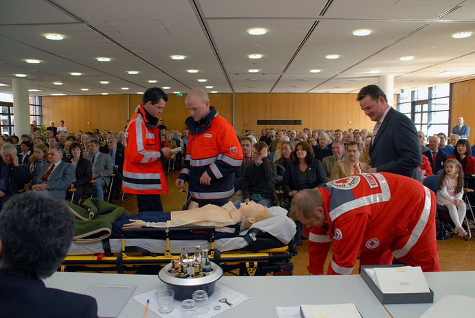 Dr. Gisela Neff, die Leitende Notärztin im Kreis Euskirchen und die Rettungsassistenten Dirk Rose, Henning Hesse und Michael Söte demonstrierten dem rund zweihundertköpfigen Publikum und der geschlossenen Vorstandsmannschaft der Kreissparkasse um Günter Flessau einen Herzinfarkt mit Atemstillstand und Reanimation. Die Zuschauer waren ehrlich beeindruckt. Die Puppe sprach sogar, gab Schmerzgeräusche von sich und reagierte unmittelbar auf die notfallmedizinischen Eingriffe der Rettungskräfte.