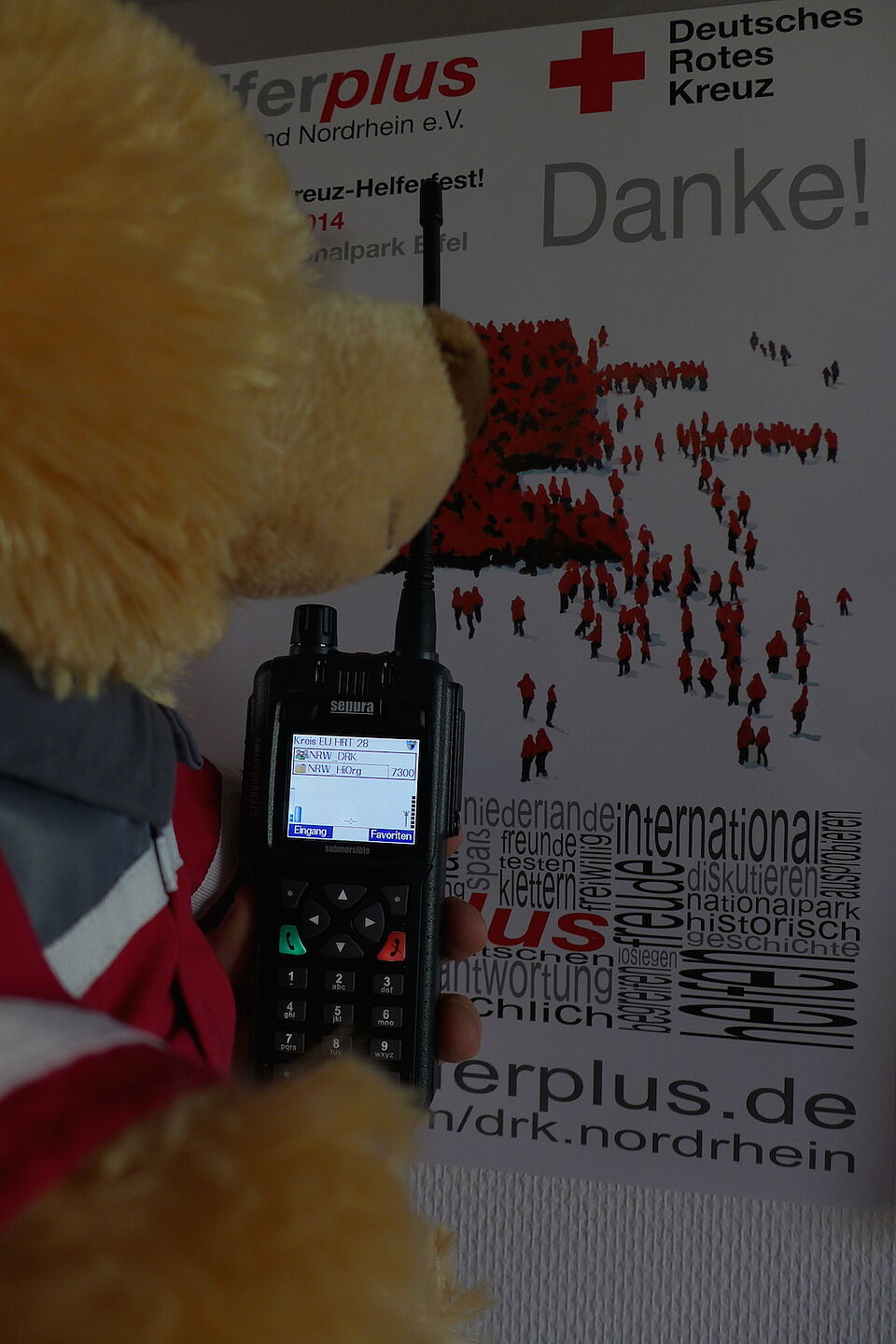 Bild DRK JS | Als erstes sah ich das Plakat zum Helferfest - und mir fiel ein, dass ich mich noch gar nicht angemeldet habe. Au weia! Bin sofort auf http/www.helferplus.de gegangen und hab das nachgeholt. Dann hab ich den Richie in Düsseldorf angefunkt - mit dem neuen Tetra-Funkgerät: "Hallo Richie, helferplus.de anmelden - jetzt aber los. Und natürlich ganz vielen weitersagen und teilen und mailen."