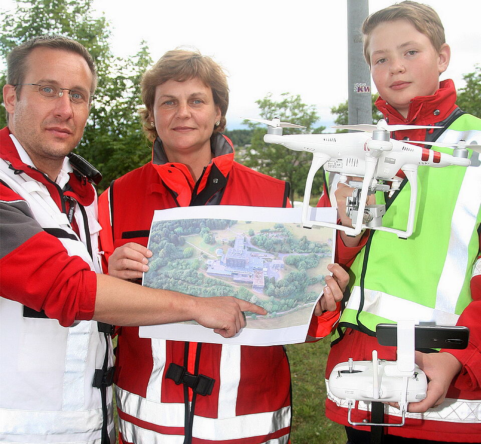 Während das DRK auf einem Parkplatz vor der Klinik bereits alles für den Rettungsfall eingerichtet hatte, startete Benjamin Artz derweil die Kameradrohne. „Uns alleine auf Satellitenbilder von Google zu verlassen, das reicht nicht. Die Bilder sind alt. Kleine Wege und das genaue, aktuelle Gelände sind nicht zu erkennen“, so der junge DRK-Helfer. Zum Glück war es noch hell genug für gute Aufnahmen. Wenige Minuten später druckte der Farbkopierer in DIN-A2-Größe das Luftbild aus.