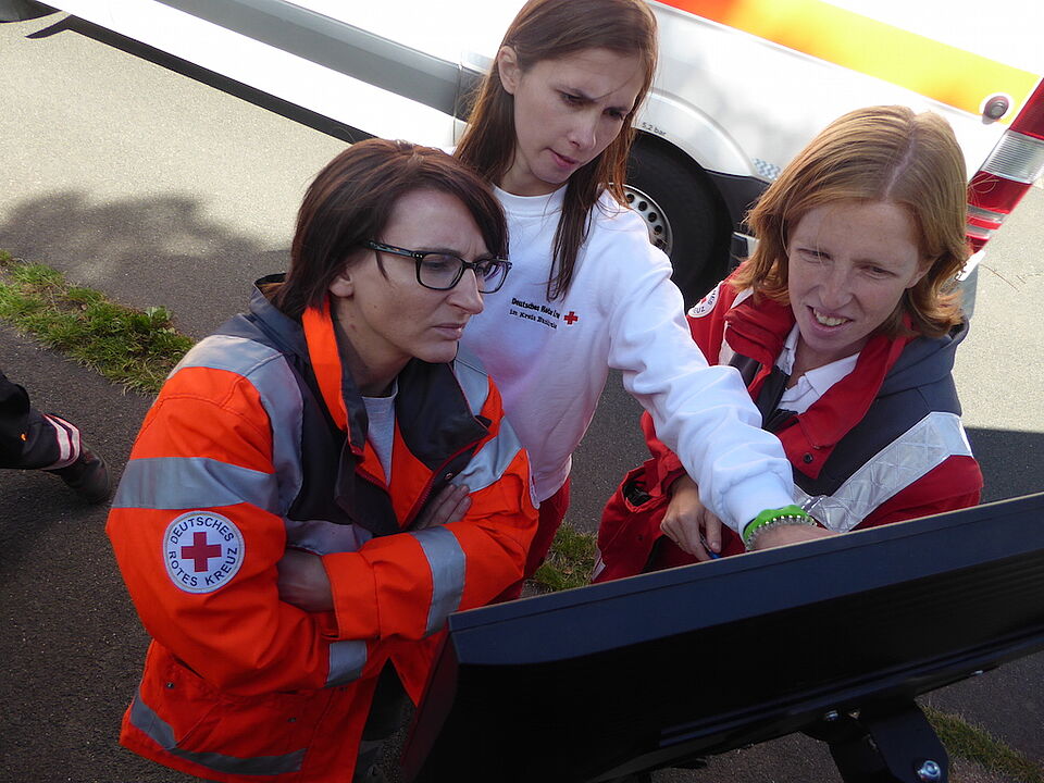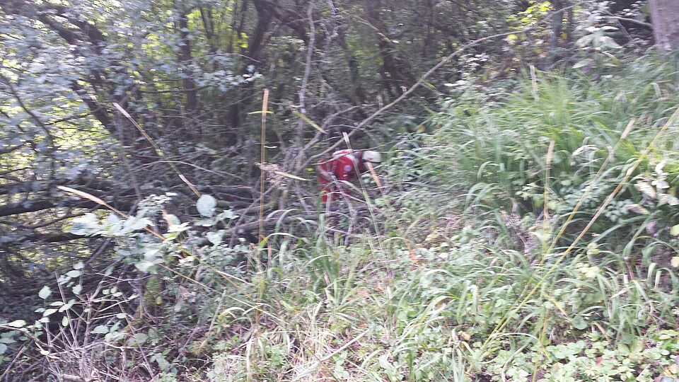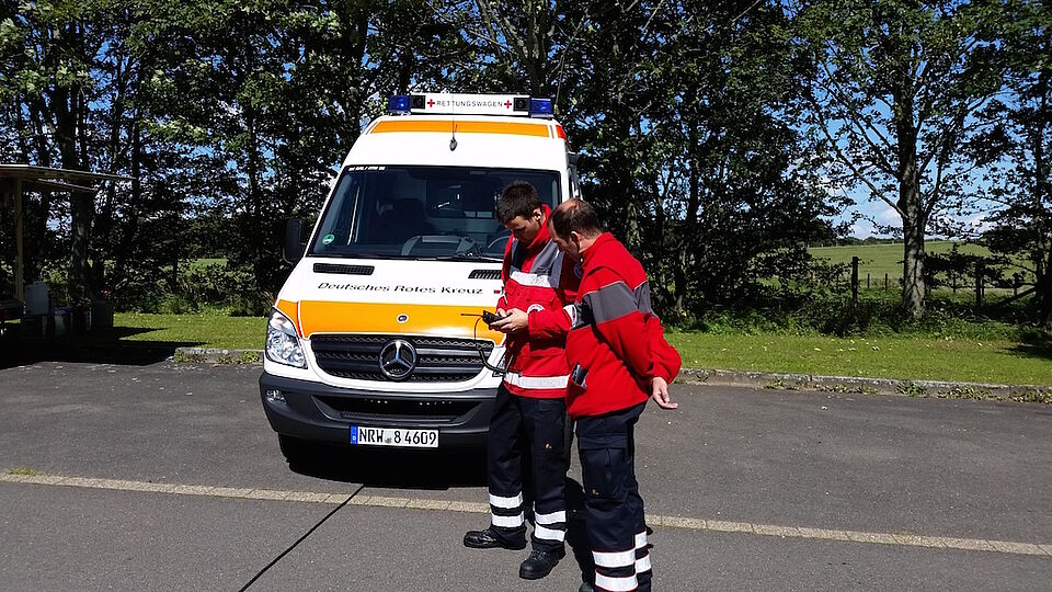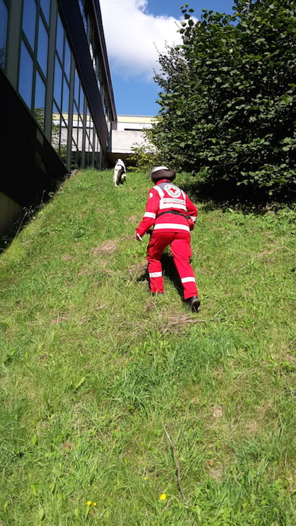 Dann die erlösende Nachricht für Kreisbereitschaftsleiter Jürgen Houbé und Rettungshunde-Einsatzleiterin Julia Tiede: Die dreijährige Labrador-Hündin „Jette“ von Hundeführer Franz Küpper fand den Mann in einem nicht einsehbaren, dichtbewachsenen Steilhang in der Nähe der Klinik. Er war glücklicherweise unversehrt und wurde mit einem Rotkreuz-Rettungswagen, der im Bereitstellungsraum stand, in ein Krankenhaus verlegt.