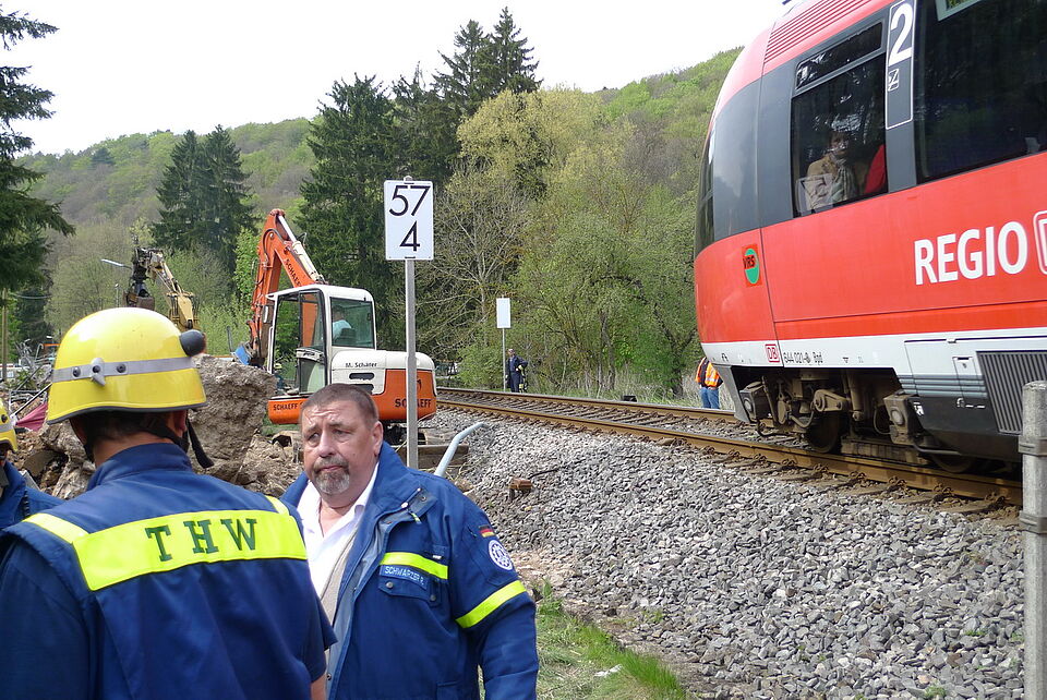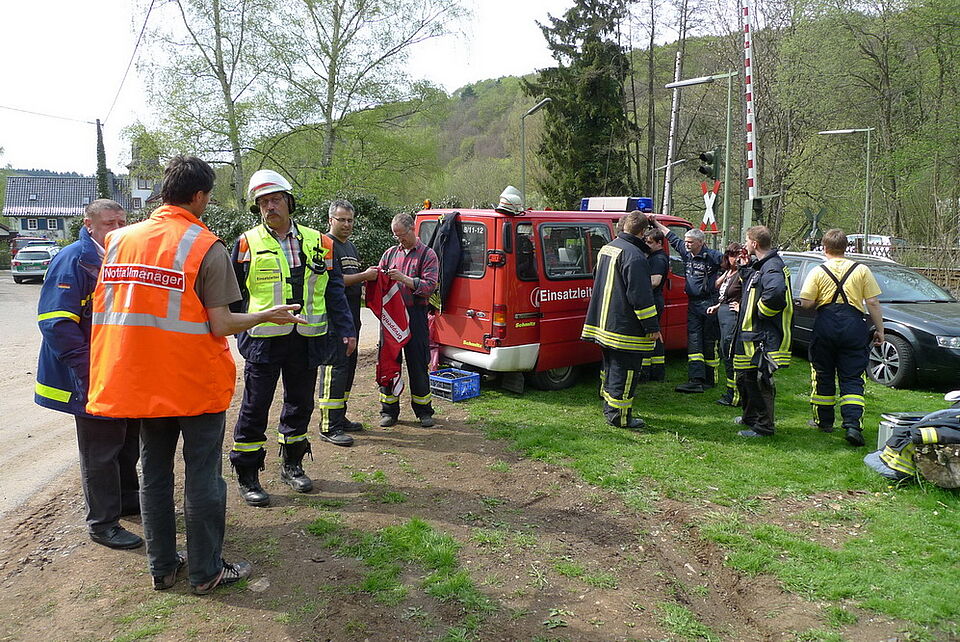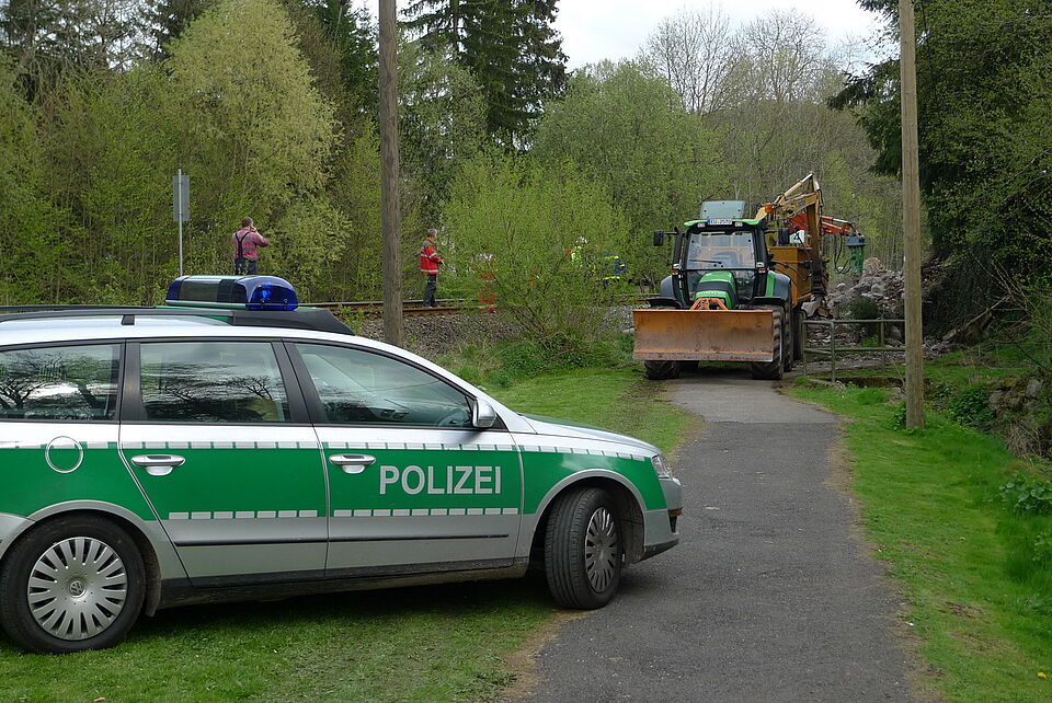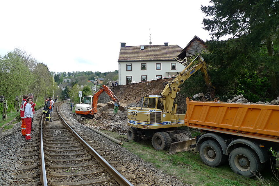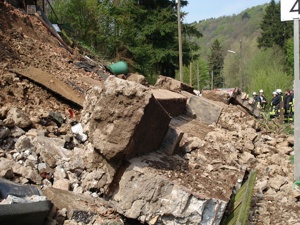 Urft - Am frühen Samstagmorgen stürzte eine rund zehn Meter hohe Stützwand unweit der Bahnstrecke Köln – Kall – Trier ein. Umgehend nach der ersten Einsatzmeldung bei der Euskirchener Rettungsleitstelle machten sich die ersten Einsatzkräfte der Gemeindefeuerwehr Kall auf den Weg nach Urft, um sich ein Bild der Lage zu verschaffen. Ein Teil der Kaller Wehrleute befand sich zu diesem Zeitpunkt auf einer Übung, so dass Unterstützung durch die Wehren aus Schleiden und Nettersheim angefordert wurde.