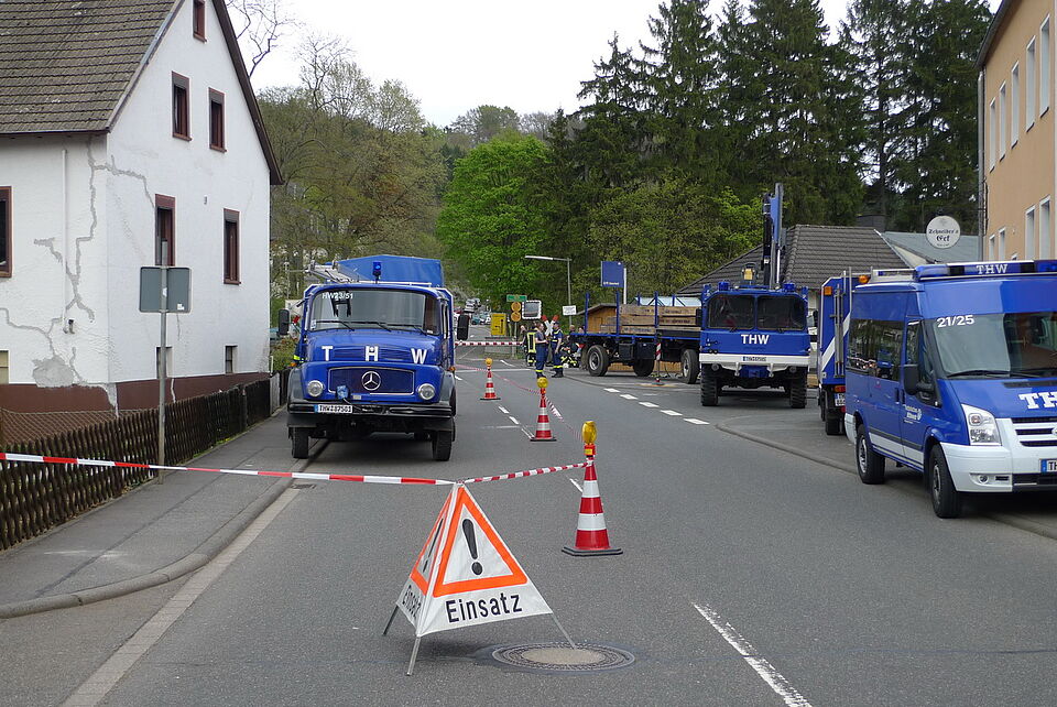 Das Gelände oberhalb der Mauer, eine Hofeinfahrt mit Garagen, drohte weiter einzustürzen. Um dieses zu verhindern, wurden Einsatzspezialisten des Technischen Hilfswerkes aus Euskirchen und Schleiden angefordert. Mittels speziellen Gerätes wurden Abstützmaßnahmen vorbereitet.