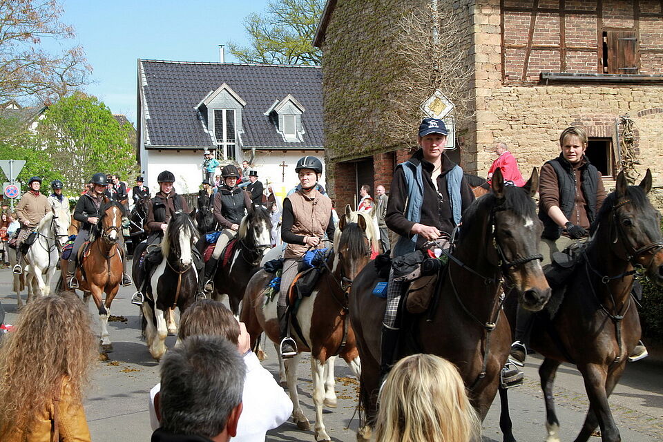 Es geht um die Erhaltung religiösen Brauchtums in der Eifel: Robert Ohlerth und die katholische Pfarrgemeinde St. Georg Kallmuth mobilisieren Helfer, Reiter, Fußpilger und Kutscher – Plakette als Belohnung – Gruppen ab acht Reitern erhalten eine eigene Fahne, die sie behalten dürfen – Erbsensuppe, Chor- und Blasmusik – Das Rote Kreuz im Kreis Euskirchen, in Sonderheit der DRK-Ortsverein Kall, passt traditionell seit vielen Jahren auf, dass die Pilger sanitätstechnisch gut versorgt sind