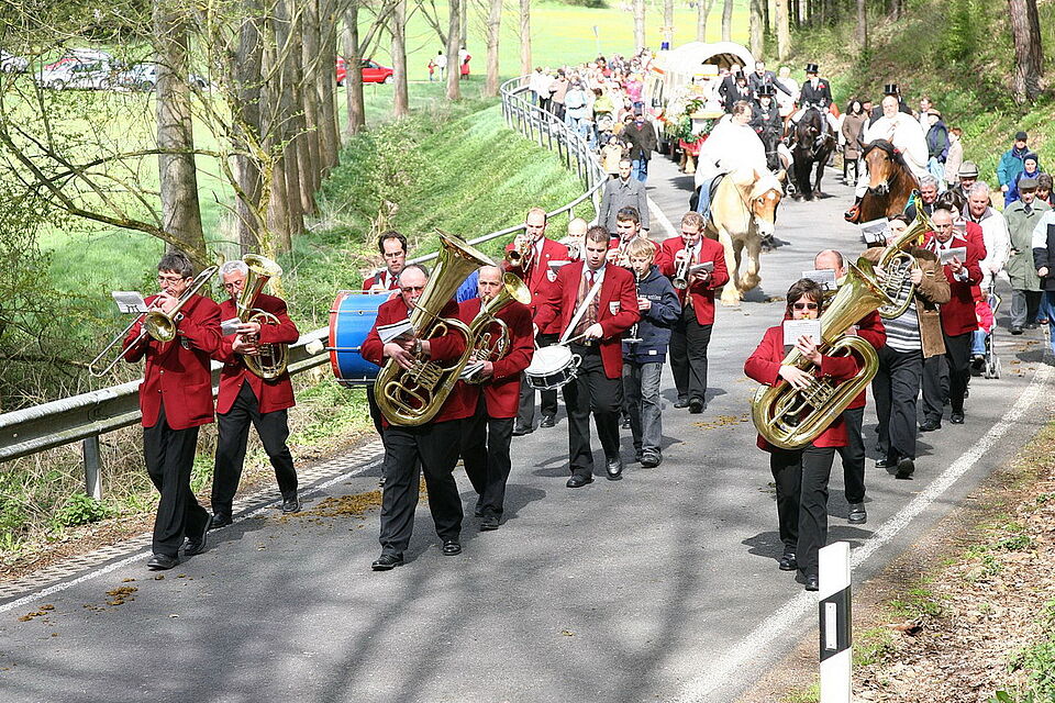 Archivfoto: pp/Agentur ProfiPress | Die Reiter- und Fußprozession auf dem Weg zum Georgspütz im Feytal zwischen Vollem und Urfey wird vom Musikverein Kallmuth angeführt. Die Wallfahrt mit Festmesse unter freiem Himmel ist seit 1666 nachgewiesen, als kombinierte Reiter- und Fußprozession findet sie seit 1953 statt – und feiert mithin am 1. Mai 2017 65jähriges Jubiläum.
