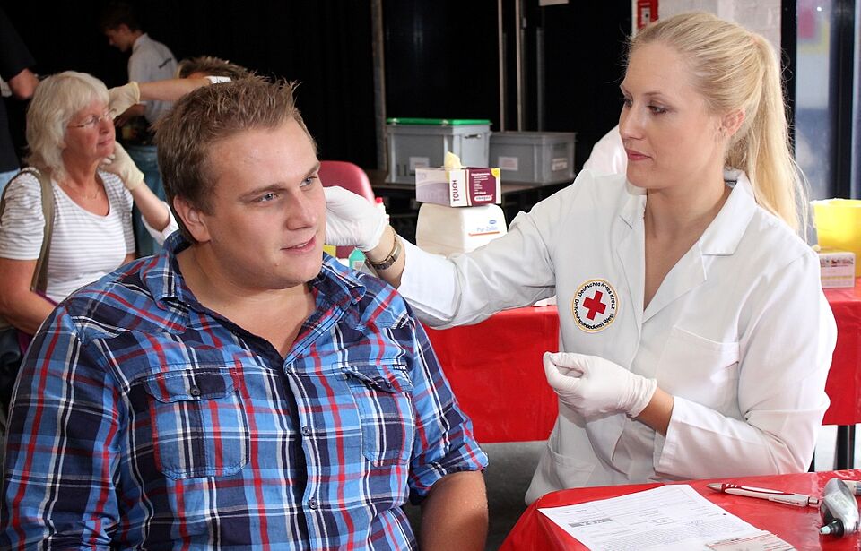 In der Halle selbst zeigte sich derweil, welch eingespieltes Team die Rotkreuzler, darunter Mitglieder des Kreisverbands sowie der Ortsverbände Euskirchen, Mechernich, Zülpich und Bad Münstereifel, sind. Reibungslos durchlaufen die Freiwilligen die verschiedenen Stationen, von der Anmeldung über den obligatorischen „Pieks“ ins Ohr, der ärztlichen Untersuchung bis auf die Liege in der großen Halle, wo die eigentliche Blutspende stattfindet.