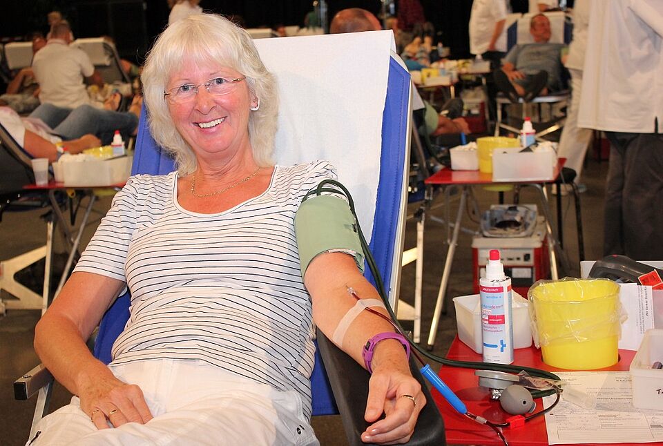 Hier liegt auch die Euskirchenerin Karin Gräf. Als „alter Hase“, der bereits 70 Mal zur Ader gelassen wurde, ist sie sichtlich entspannt, als der Rotkreuz-Arzt Hartmut Mösges die Nadel ansetzt. Enkelin Eva hält der Oma dennoch sicherheitshalber die Hand. Ein paar Liegen weiter fließt der rote Lebenssaft aus dem Arm von Martha Musiol aus Lückerath. „Ich finde es wichtig, Blut zu spenden, zumal ich mit B negativ eine seltene Blutgruppe habe“, sagt sie. Auch Christian Mahlberg liegt schließlich auf der Liege: Die Nadel ist gesetzt, seine erste Blutspende, die auch ihn zum potenziellen Lebensretter macht, steht unmittelbar bevor. „Alles okay“, sagt er und streckt den Daumen nach oben, „mir geht’s gut.“