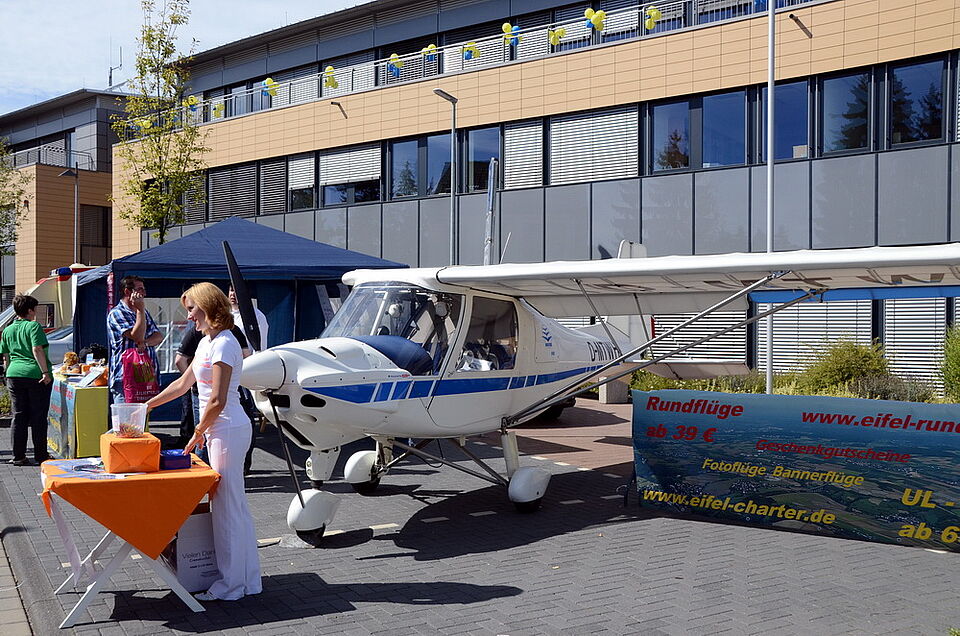 An Mathias Rusts Landung mit einer einmotorigen Sportmaschine auf dem Roten Platz von Moskau fühlten sich die Brunnenfest-Besucher auf den Mechernicher Rathausplatz erinnert. Ultraleicht-Piloten hatten dort ein Ultraleicht-Flugzeug in Position gebracht, allerdings nur mit einer ausgeklappten Tragfläche, um dort für ihre Charterflüge über der Eifel zu werben. Der Flieger war allerdings nicht auf dem Rathausplatz gelandet, sondern mit dem Autoanhänger angelandet worden.